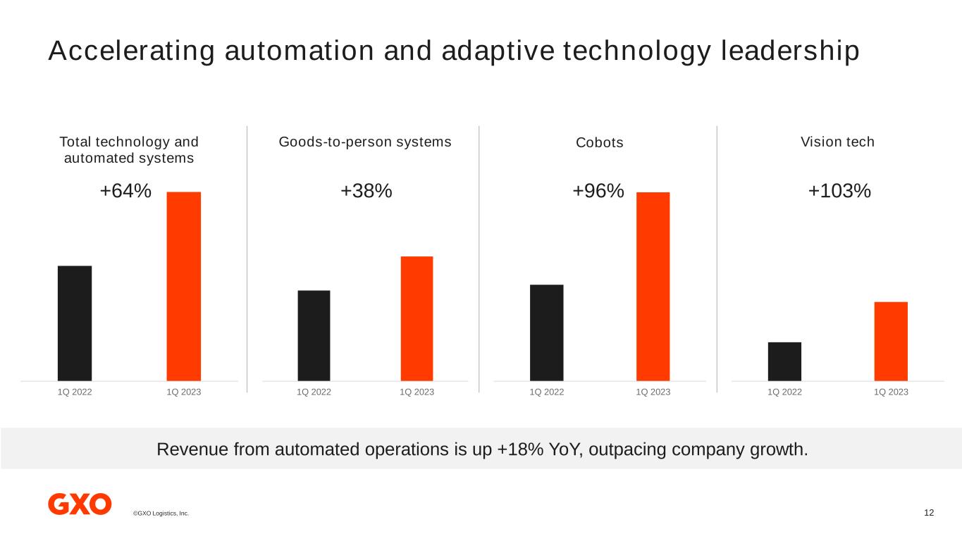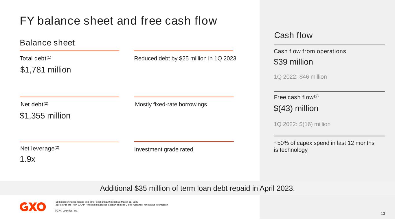 12©GXO Logistics, Inc. 1Q 2022 1Q 2023 Vision tech 1Q 2022 1Q 2023 Cobots 1Q 2022 1Q 2023 Goods-to-person systems Accelerating automation and adaptive technology leadership Revenue from automated operations is up +18% YoY, outpacing company growth. +64% +38% +96% +103% 1Q 2022 1Q 2023 Total technology and automated systems