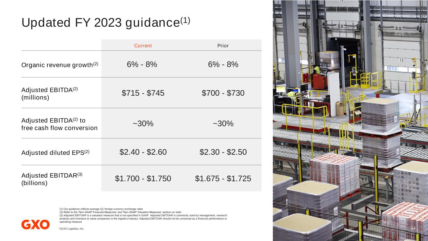 13©GXO Logistics, Inc. FY balance sheet and free cash flow (1) Includes finance leases and other debt of $139 million at March 31, 2023 (2) Refer to the ‘Non-GAAP Financial Measures’ section on slide 2 and Appendix for related information Cash flow from operations Free cash flow(2) 1Q 2022: $(16) million Cash flow Balance sheet Total debt(1) $1,781 million Mostly fixed-rate borrowings Investment grade rated $39 million ~50% of capex spend in last 12 months is technology 1Q 2022: $46 million $(43) million Net debt(2) $1,355 million 13 Net leverage(2) 1.9x Reduced debt by $25 million in 1Q 2023 Additional $35 million of term loan debt repaid in April 2023.