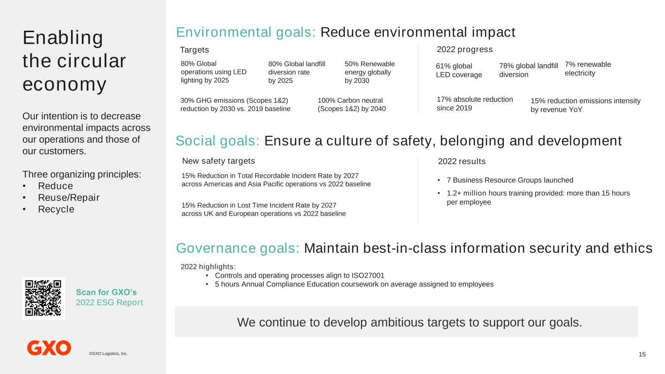 15©GXO Logistics, Inc. We continue to develop ambitious targets to support our goals. Governance goals: Maintain best-in-class information security and ethics Social goals: Ensure a culture of safety, belonging and development 78% global landfill diversion 7% renewable electricity 17% absolute reduction since 2019 2022 progress 61% global LED coverage ©GXO Logistics, Inc. 80% Global landfill diversion rate by 2025 30% GHG emissions (Scopes 1&2) reduction by 2030 vs. 2019 baseline 100% Carbon neutral (Scopes 1&2) by 2040 80% Global operations using LED lighting by 2025 50% Renewable energy globally by 2030 Targets New safety targets • 7 Business Resource Groups launched • 1.2+ million hours training provided: more than 15 hours per employee 2022 highlights: • Controls and operating processes align to ISO27001 • 5 hours Annual Compliance Education coursework on average assigned to employees Enabling the circular economy Our intention is to decrease environmental impacts across our operations and those of our customers. Three organizing principles: • Reduce • Reuse/Repair • Recycle Environmental goals: Reduce environmental impact 15% reduction emissions intensity by revenue YoY 15% Reduction in Total Recordable Incident Rate by 2027 across Americas and Asia Pacific operations vs 2022 baseline 15% Reduction in Lost Time Incident Rate by 2027 across UK and European operations vs 2022 baseline 2022 results Scan for GXO’s 2022 ESG Report