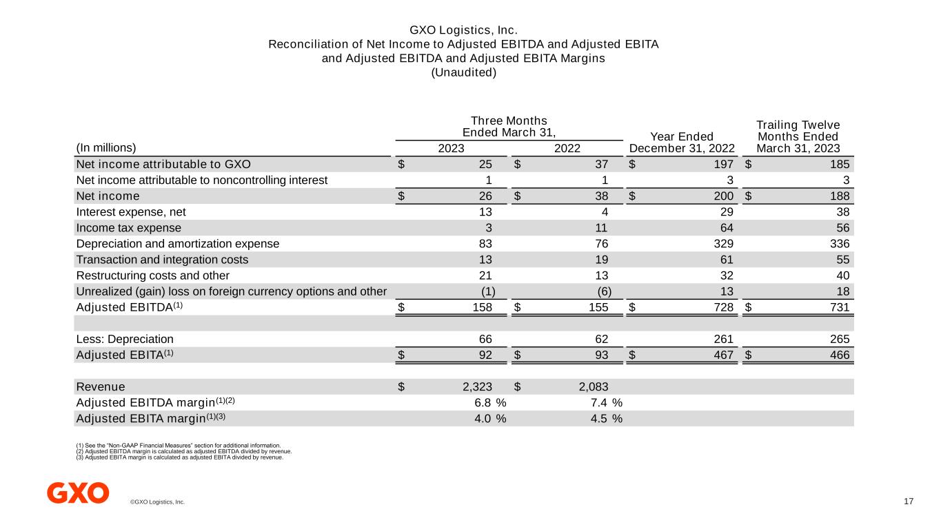 17©GXO Logistics, Inc. GXO Logistics, Inc. Reconciliation of Net Income to Adjusted EBITDA and Adjusted EBITA and Adjusted EBITDA and Adjusted EBITA Margins (Unaudited) Three Months Ended March 31, Year Ended December 31, 2022 Trailing Twelve Months Ended March 31, 2023(In millions) 2023 2022 Net income attributable to GXO $ 25 $ 37 $ 197 $ 185 Net income attributable to noncontrolling interest 1 1 3 3 Net income $ 26 $ 38 $ 200 $ 188 Interest expense, net 13 4 29 38 Income tax expense 3 11 64 56 Depreciation and amortization expense 83 76 329 336 Transaction and integration costs 13 19 61 55 Restructuring costs and other 21 13 32 40 Unrealized (gain) loss on foreign currency options and other (1) (6) 13 18 Adjusted EBITDA(1) $ 158 $ 155 $ 728 $ 731 Less: Depreciation 66 62 261 265 Adjusted EBITA(1) $ 92 $ 93 $ 467 $ 466 Revenue $ 2,323 $ 2,083 Adjusted EBITDA margin(1)(2) 6.8 % 7.4 % Adjusted EBITA margin(1)(3) 4.0 % 4.5 % (1) See the “Non-GAAP Financial Measures” section for additional information. (2) Adjusted EBITDA margin is calculated as adjusted EBITDA divided by revenue. (3) Adjusted EBITA margin is calculated as adjusted EBITA divided by revenue.