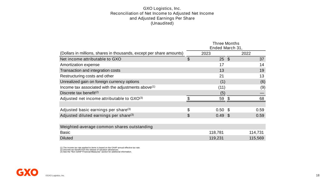 18©GXO Logistics, Inc. GXO Logistics, Inc. Reconciliation of Net Income to Adjusted Net Income and Adjusted Earnings Per Share (Unaudited) Three Months Ended March 31, (Dollars in millions, shares in thousands, except per share amounts) 2023 2022 Net income attributable to GXO $ 25 $ 37 Amortization expense 17 14 Transaction and integration costs 13 19 Restructuring costs and other 21 13 Unrealized gain on foreign currency options (1) (6) Income tax associated with the adjustments above(1) (11) (9) Discrete tax benefit(2) (5) — Adjusted net income attributable to GXO(3) $ 59 $ 68 Adjusted basic earnings per share(3) $ 0.50 $ 0.59 Adjusted diluted earnings per share(3) $ 0.49 $ 0.59 Weighted-average common shares outstanding Basic 118,781 114,731 Diluted 119,231 115,569 (1) The income tax rate applied to items is based on the GAAP annual effective tax rate. (2) Discrete tax benefit from the release of valuation allowances. (3) See the “Non-GAAP Financial Measures” section for additional information.