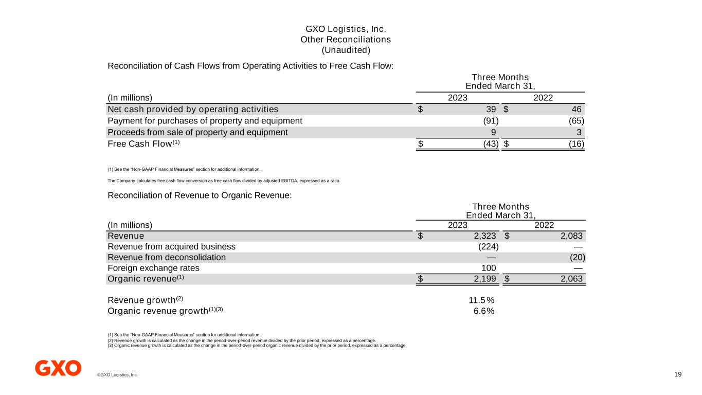19©GXO Logistics, Inc. GXO Logistics, Inc. Other Reconciliations (Unaudited) Reconciliation of Cash Flows from Operating Activities to Free Cash Flow: Three Months Ended March 31, (In millions) 2023 2022 Net cash provided by operating activities $ 39 $ 46 Payment for purchases of property and equipment (91) (65) Proceeds from sale of property and equipment 9 3 Free Cash Flow(1) $ (43) $ (16) (1) See the “Non-GAAP Financial Measures” section for additional information. The Company calculates free cash flow conversion as free cash flow divided by adjusted EBITDA, expressed as a ratio. Reconciliation of Revenue to Organic Revenue: Three Months Ended March 31, (In millions) 2023 2022 Revenue $ 2,323 $ 2,083 Revenue from acquired business (224) — Revenue from deconsolidation — (20) Foreign exchange rates 100 — Organic revenue(1) $ 2,199 $ 2,063 Revenue growth(2) 11.5 % Organic revenue growth(1)(3) 6.6% (1) See the “Non-GAAP Financial Measures” section for additional information. (2) Revenue growth is calculated as the change in the period-over-period revenue divided by the prior period, expressed as a percentage. (3) Organic revenue growth is calculated as the change in the period-over-period organic revenue divided by the prior period, expressed as a percentage.