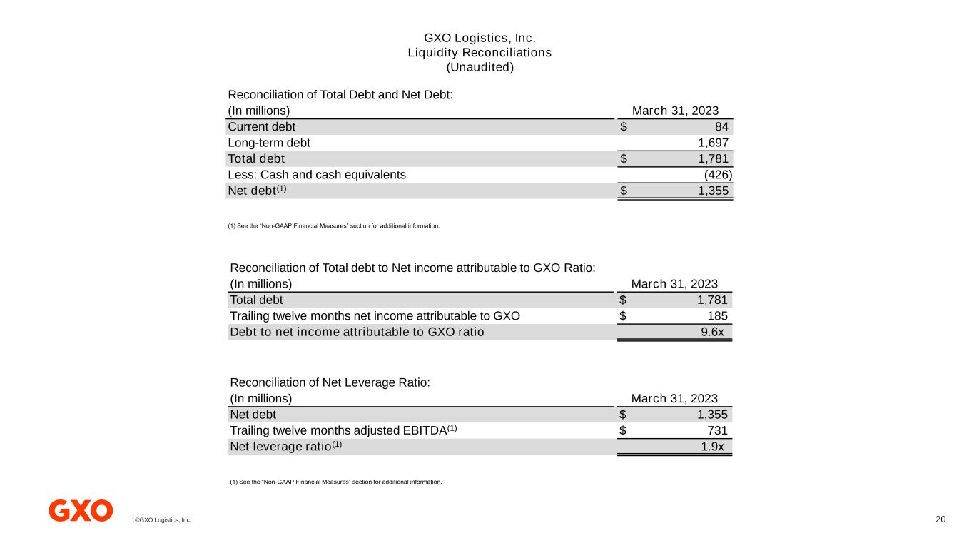 20©GXO Logistics, Inc. GXO Logistics, Inc. Liquidity Reconciliations (Unaudited) Reconciliation of Total Debt and Net Debt: (In millions) March 31, 2023 Current debt $ 84 Long-term debt 1,697 Total debt $ 1,781 Less: Cash and cash equivalents (426) Net debt(1) $ 1,355 (1) See the “Non-GAAP Financial Measures” section for additional information. Reconciliation of Total debt to Net income attributable to GXO Ratio: (In millions) March 31, 2023 Total debt $ 1,781 Trailing twelve months net income attributable to GXO $ 185 Debt to net income attributable to GXO ratio 9.6x Reconciliation of Net Leverage Ratio: (In millions) March 31, 2023 Net debt $ 1,355 Trailing twelve months adjusted EBITDA(1) $ 731 Net leverage ratio(1) 1.9x (1) See the “Non-GAAP Financial Measures” section for additional information.