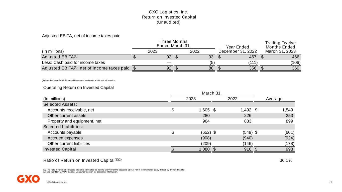 21©GXO Logistics, Inc. GXO Logistics, Inc. Return on Invested Capital (Unaudited) Adjusted EBITA, net of income taxes paid Three Months Ended March 31, Year Ended December 31, 2022 Trailing Twelve Months Ended March 31, 2023(In millions) 2023 2022 Adjusted EBITA(1) $ 92 $ 93 $ 467 $ 466 Less: Cash paid for income taxes — (5) (111) (106) Adjusted EBITA(1), net of income taxes paid $ 92 $ 88 $ 356 $ 360 (1) See the “Non-GAAP Financial Measures” section of additional information. Operating Return on Invested Capital March 31, (In millions) 2023 2022 Average Selected Assets: Accounts receivable, net $ 1,605 $ 1,492 $ 1,549 Other current assets 280 226 253 Property and equipment, net 964 833 899 Selected Liabilities: Accounts payable $ (652) $ (549) $ (601) Accrued expenses (908) (940) (924) Other current liabilities (209) (146) (178) Invested Capital $ 1,080 $ 916 $ 998 Ratio of Return on Invested Capital(1)(2) 36.1% (1) The ratio of return on invested capital is calculated as trailing twelve months adjusted EBITA, net of income taxes paid, divided by invested capital. (2) See the “Non-GAAP Financial Measures” section for additional information.
