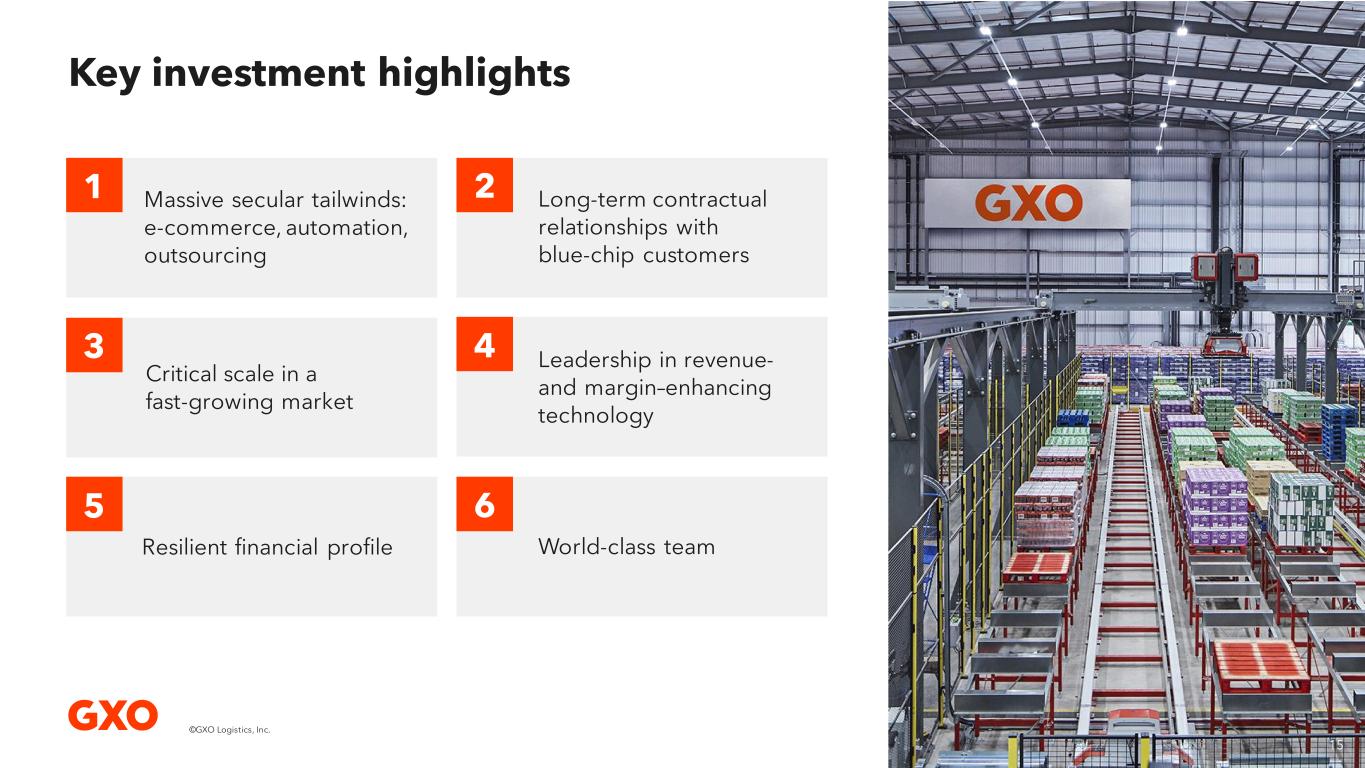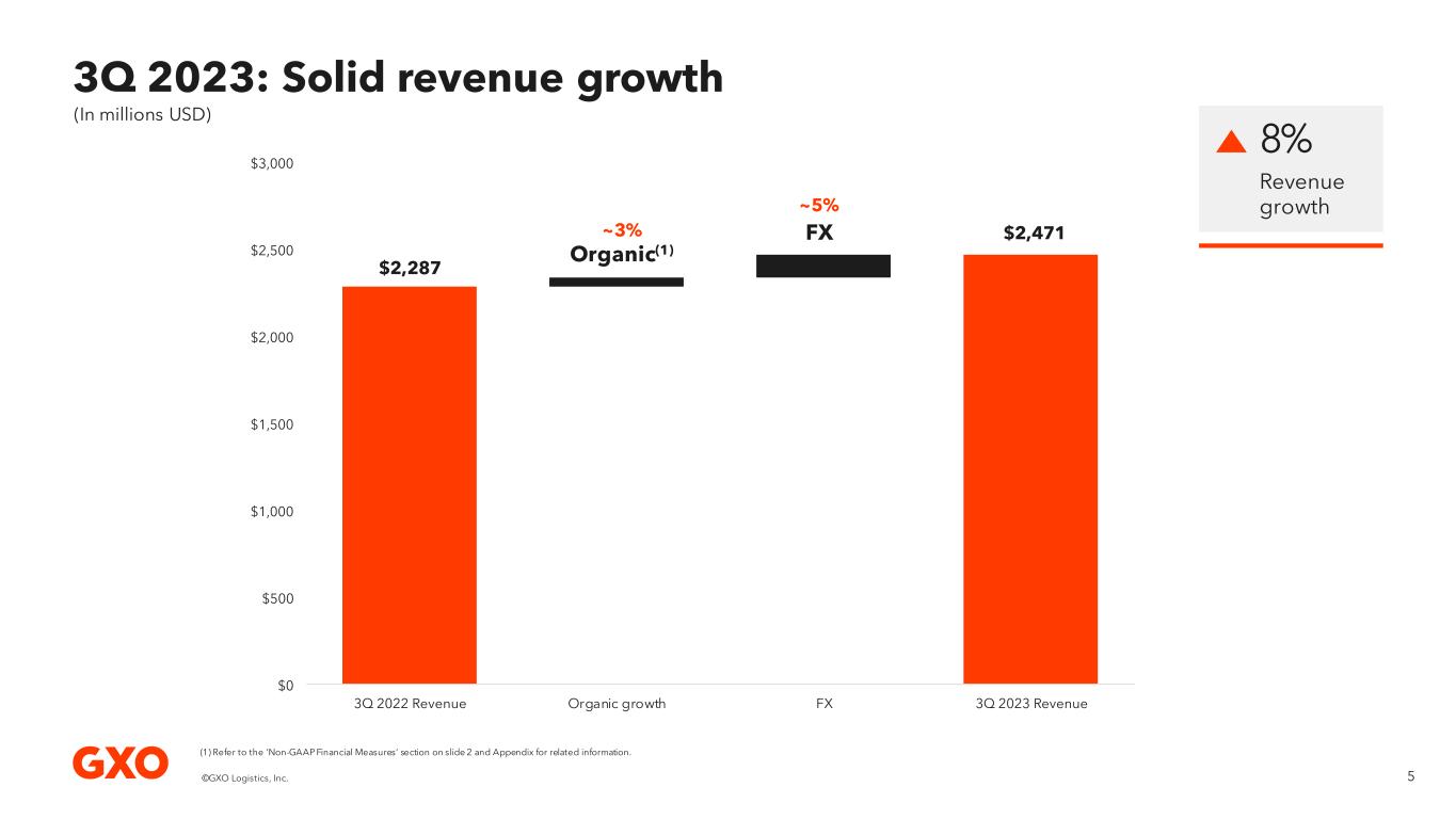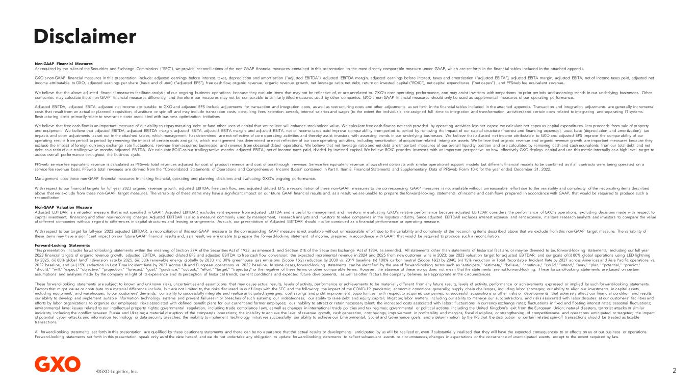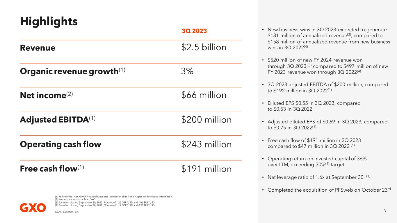 2©GXO Logistics, Inc. Disclaimer 2 Non-GAAP Financial Measures As required by the rules of the Securities and Exchange Commission (“SEC”), we provide reconciliations of the non-GAAP financial measures contained in this presentation to the most directly comparable measure under GAAP, which are set forth in the financ ial tables included in the attached appendix. GXO’s non-GAAP financial measures in this presentation include: adjusted earnings before interest, taxes, depreciation and amortization (“adjusted EBITDA”), adjusted EBITDA margin, adjusted earnings before interest, taxes and amortization (“adjusted EBITA”), adjusted EBITA margin, adjusted EBITA, net of income taxes paid, adjusted net income attributable to GXO, adjusted earnings per share (basic and diluted) (“adjusted EPS”), free cash flow, organic revenue , organic revenue growth, net leverage ratio, net debt, return on invested capital (“ROIC”), net capital expenditures (“net capex”) , and PFSweb fee equivalent revenue.. We believe that the above adjusted financial measures facilitate analysis of our ongoing business operations because they exc lude items that may not be reflective of, or are unrelated to, GXO’s core operating performance, and may assist investors with comparisons to prior periods and assessing trends in our underlying businesses. Other companies may calculate these non-GAAP financial measures differently, and therefore our measures may not be comparable to similarly titled measures used by other companies. GXO’s non-GAAP financial measures should only be used as supplemental measures of our operating performance. Adjusted EBITDA, adjusted EBITA, adjusted net income attributable to GXO and adjusted EPS include adjustments for transaction and integration costs, as well as restructuring costs and other adjustments as set forth in the financial tables included in the attached appendix. Transaction and integration adjustments are generally incremental costs that result from an actual or planned acquisition, divestiture or spin-off and may include transaction costs, consulting fees, retention awards, internal salaries and wages (to the extent the individuals are assigned full -time to integration and transformation activities) and certain costs related to integrating and separating IT systems. Restructuring costs primarily relate to severance costs associated with business optimization initiatives. We believe that free cash flow is an important measure of our ability to repay maturing debt or fund other uses of capital that we believe will enhance stockholder value. We calculate free cash flow as net cash provided by operating activities less net capex; we calculate net capex as capital expenditures less proceeds from sale of property and equipment. We believe that adjusted EBITDA, adjusted EBITDA margin, adjusted EBITA, adjusted EBITA margin, and adjusted EBITA, net of income taxes paid improve comparability from period to period by removing the impact of our capital structure (interest and financing expenses), asset base (depreciation and amortization), tax impacts and other adjustments as set out in the attached tables, which management has determined are not reflective of core operating activities and thereby assist investors with assessing trends in our underlying businesses. We believe that adjusted net income attributable to GXO and adjusted EPS improve the comparability of our operating results from period to period by removing the impact of certain costs and gains, which management has determined ar e not reflective of our core operating activities, including amortization of acquisition-related intangible assets. We believe that organic revenue and organic revenue growth are important measures because they exclude the impact of foreign currency exchange rate fluctuations, revenue from acquired businesses and revenue from deconsol idated operations. We believe that net leverage ratio and net debt are important measures of our overall liquidity position and are calculated by removing cash and cash equivalents from our total debt and net debt as a ratio of our trailing twelve months adjusted EBITDA. We calculate ROIC as our trailing twelve months adjusted EBITA, net of income taxes paid, divided by invested capital. We believe ROIC provides investors with an important perspective on how effectively GXO deploys capital and use this metric internally as a high-level target to assess overall performance throughout the business cycle. PFSweb service fee equivalent revenue is calculated as PFSweb total revenues adjusted for cost of product revenue and cost of pass-through revenue. Service fee equivalent revenue allows client contracts with similar operational support models but different financial models to be combined as if all contracts were being operated on a service fee revenue basis. PFSweb total revenues are derived from the “Consolidated Statements of Operations and Comprehensive Income (Loss)” contained in Part II, Item 8. Financial Statements and Supplementary Data of PFSweb Form 10-K for the year ended December 31, 2022. Management uses these non-GAAP financial measures in making financial, operating and planning decisions and evaluating GXO’s ongoing performance. With respect to our financial targets for full-year 2023 organic revenue growth, adjusted EBITDA, free cash flow, and adjusted diluted EPS, a reconciliation of these non-GAAP measures to the corresponding GAAP measures is not available without unreasonable effort due to the variability and complexity of the reconciling items described above that we exclude from these non-GAAP target measures. The variability of these items may have a significant impact on our future GAAP financial results and, as a result, we are unable to prepare the forward-looking statements of income and cash flows prepared in accordance with GAAP, that would be required to produce such a reconciliation. Non-GAAP Valuation Measure Adjus