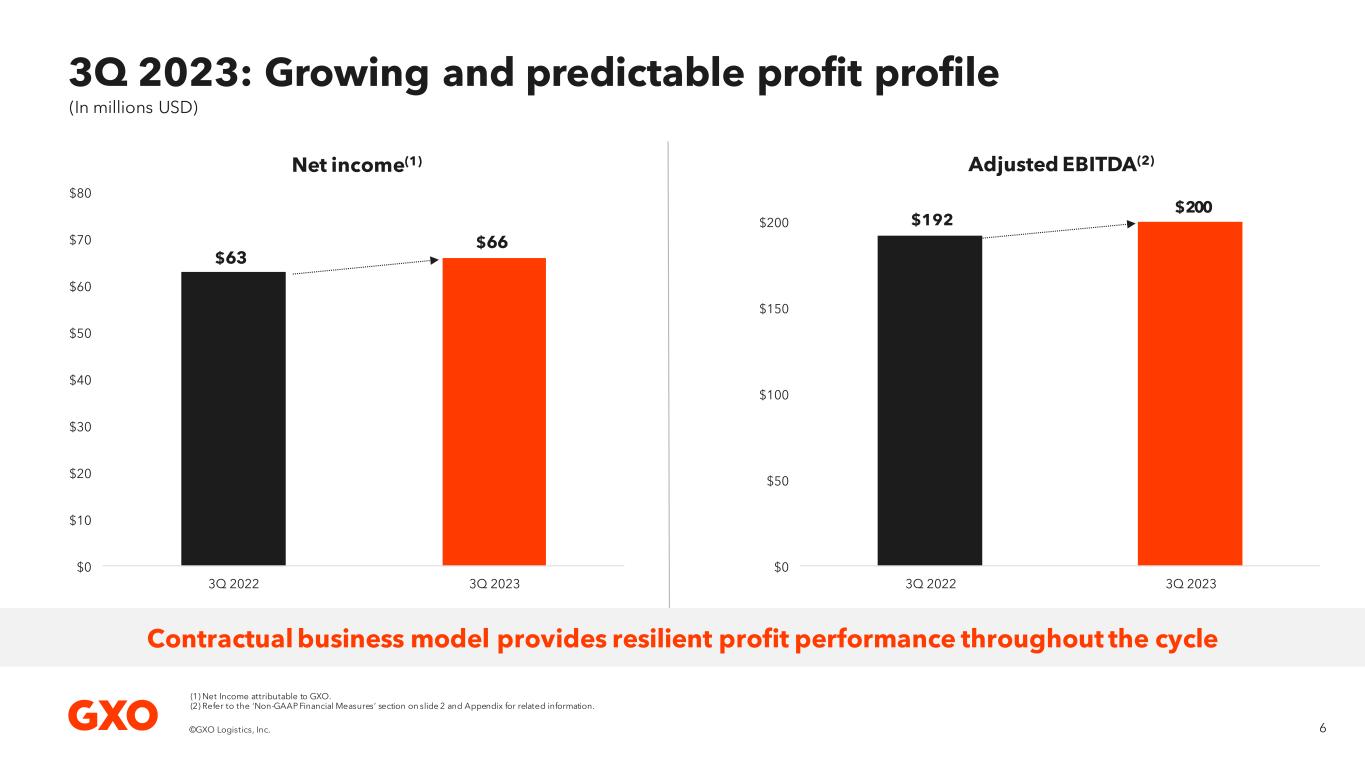 5©GXO Logistics, Inc. $0 $500 $1,000 $1,500 $2,000 $2,500 $3,000 3Q 2022 Revenue Organic growth FX 3Q 2023 Revenue 3Q 2023: Solid revenue growth ~3% Organic(1) ~5% FX 8% Revenue growth (1) Refer to the ‘Non-GAAP Financial Measures’ section on slide 2 and Appendix for related information. (In millions USD) $2,287 $2,471