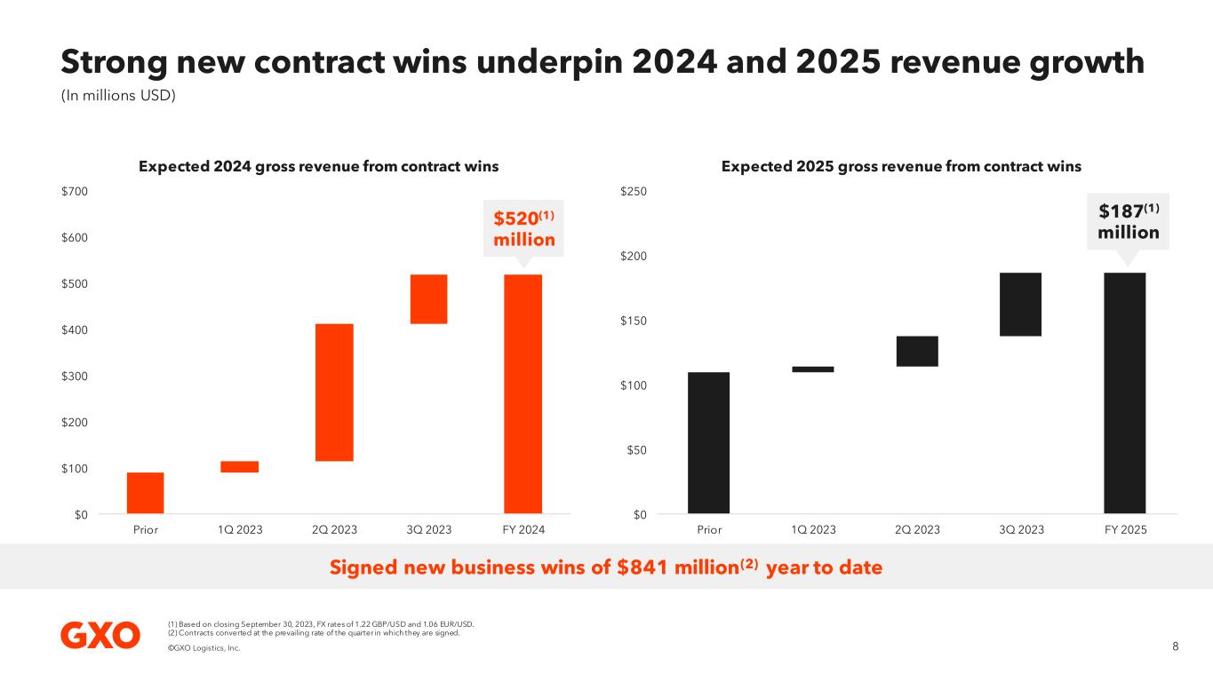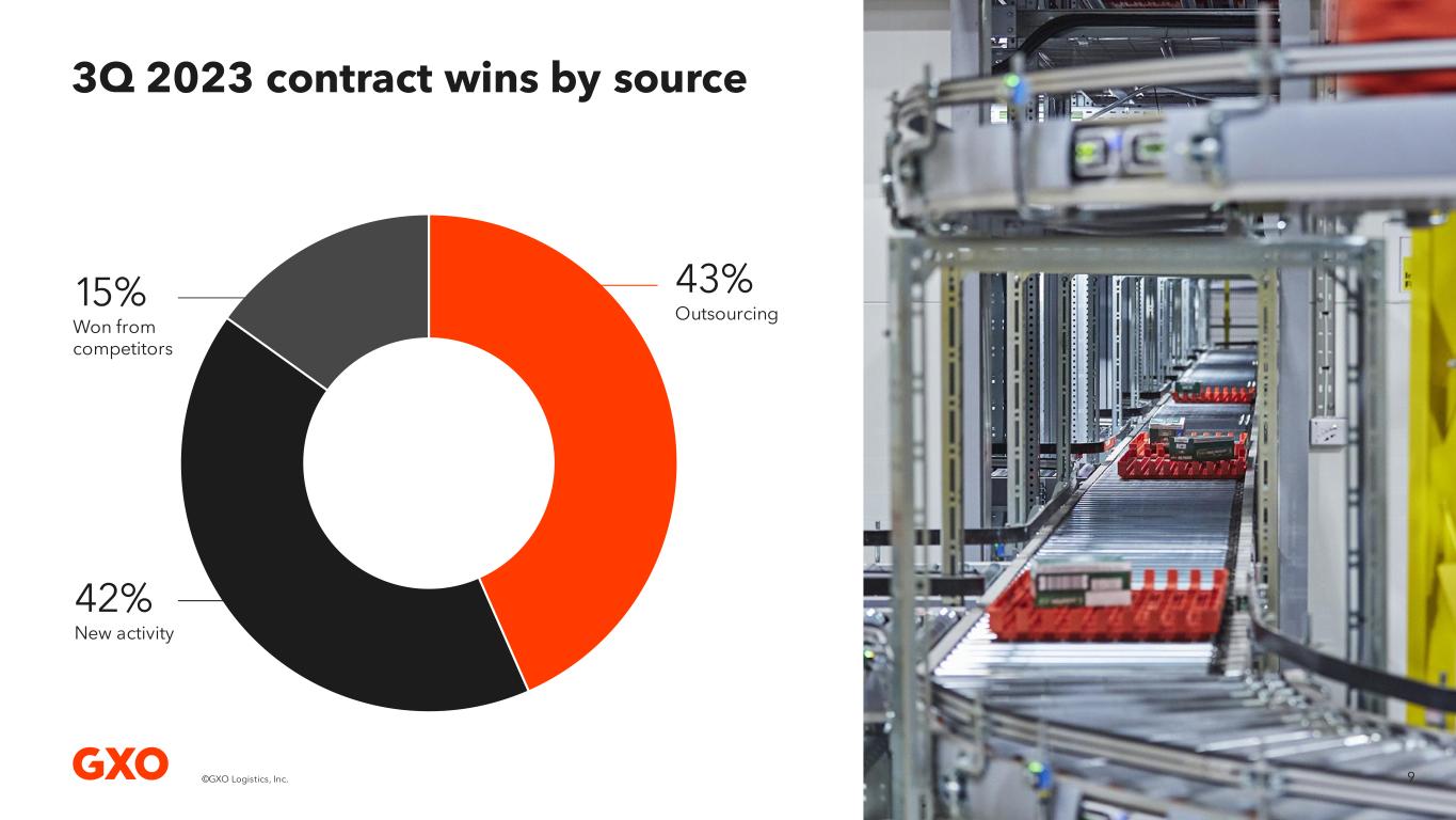 8©GXO Logistics, Inc. $0 $100 $200 $300 $400 $500 $600 $700 Prior 1Q 2023 2Q 2023 3Q 2023 FY 2024 Expected 2024 gross revenue from contract wins $0 $50 $100 $150 $200 $250 Prior 1Q 2023 2Q 2023 3Q 2023 FY 2025 Expected 2025 gross revenue from contract wins Strong new contract wins underpin 2024 and 2025 revenue growth (1) Based on closing September 30, 2023, FX rates of 1.22 GBP/USD and 1.06 EUR/USD. (2) Contracts converted at the prevailing rate of the quarter in which they are signed. $520(1) million $187(1) million (In millions USD) Signed new business wins of $841 million(2) year to date