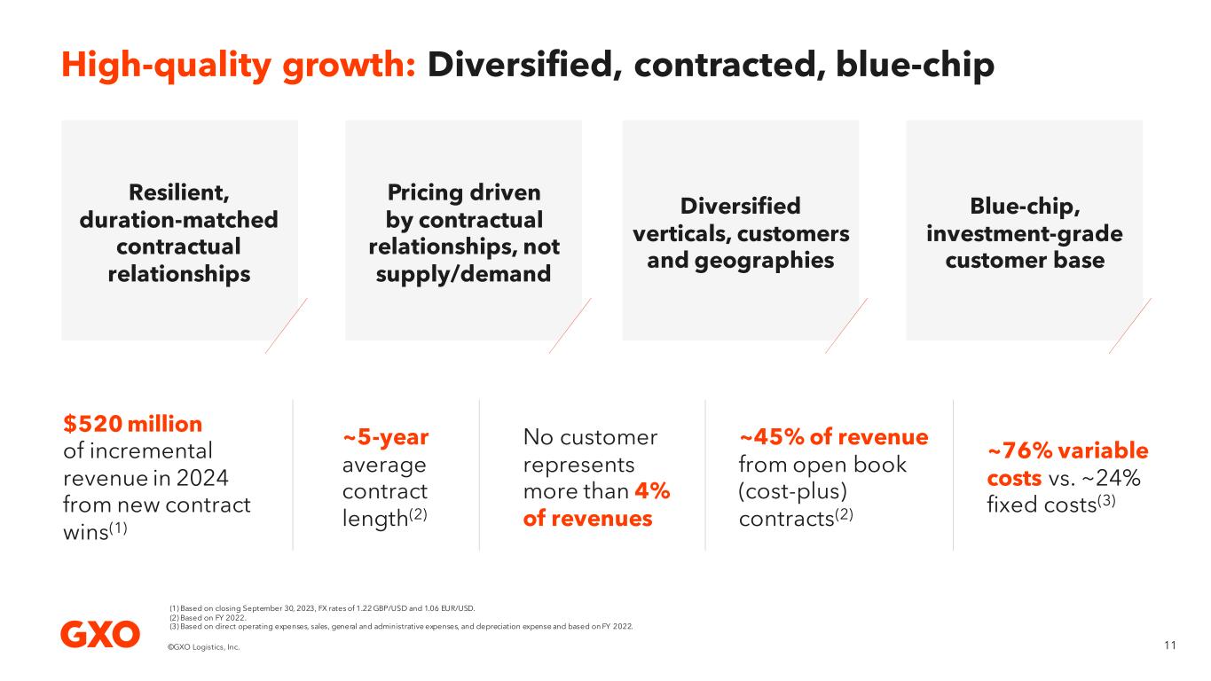 11©GXO Logistics, Inc. High-quality growth: Diversified, contracted, blue-chip Resilient, duration-matched contractual relationships Pricing driven by contractual relationships, not supply/demand Diversified verticals, customers and geographies Blue-chip, investment-grade customer base $520 million of incremental revenue in 2024 from new contract wins(1) ~5-year average contract length(2) No customer represents more than 4% of revenues ~45% of revenue from open book (cost-plus) contracts(2) ~76% variable costs vs. ~24% fixed costs(3) (1) Based on closing September 30, 2023, FX rates of 1.22 GBP/USD and 1.06 EUR/USD. (2) Based on FY 2022. (3) Based on direct operating expenses, sales, general and administrative expenses, and depreciation expense and based on FY 2022.