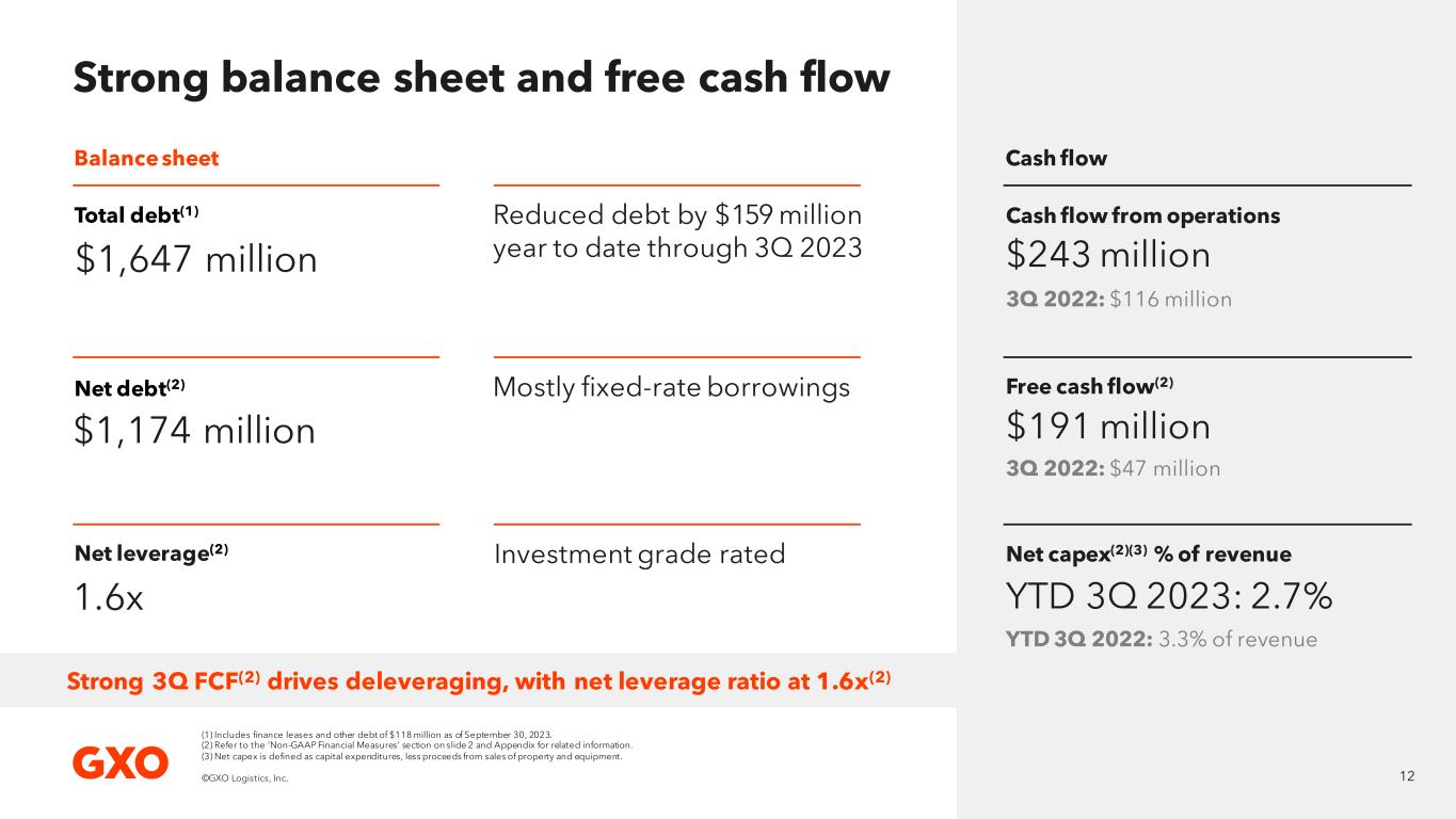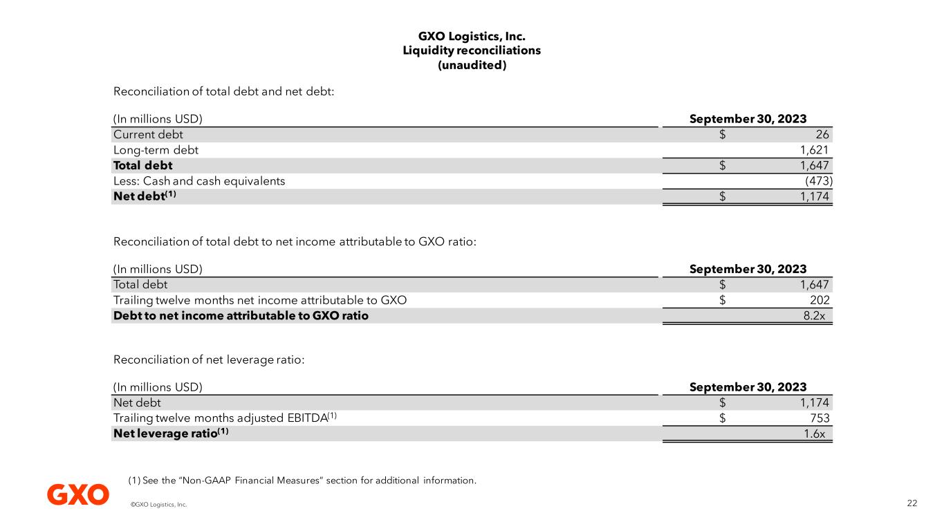 22©GXO Logistics, Inc. GXO Logistics, Inc. Liquidity reconciliations (unaudited) Reconciliation of total debt and net debt: (In millions USD) September 30, 2023 Current debt $ 26 Long-term debt 1,621 Total debt $ 1,647 Less: Cash and cash equivalents (473) Net debt(1) $ 1,174 Reconciliation of total debt to net income attributable to GXO ratio: (In millions USD) September 30, 2023 Total debt $ 1,647 Trailing twelve months net income attributable to GXO $ 202 Debt to net income attributable to GXO ratio 8.2x Reconciliation of net leverage ratio: (In millions USD) September 30, 2023 Net debt $ 1,174 Trailing twelve months adjusted EBITDA(1) $ 753 Net leverage ratio(1) 1.6x (1) See the “Non-GAAP Financial Measures” section for additional information.