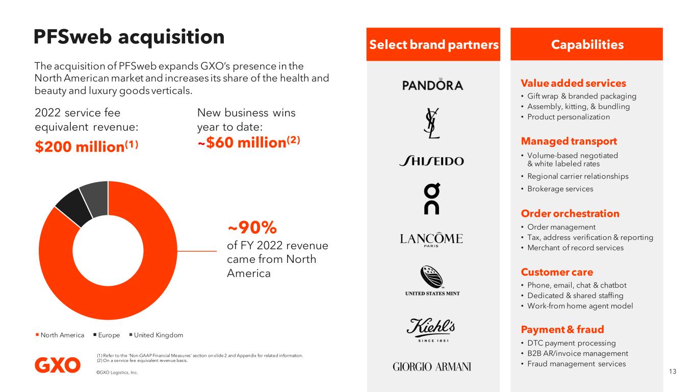 13©GXO Logistics, Inc. PFSweb acquisition 2022 service fee equivalent revenue: $200 million(1) Select brand partners New business wins year to date: ~$60 million(2) The acquisition of PFSweb expands GXO’s presence in the North American market and increases its share of the health and beauty and luxury goods verticals. Value added services Managed transport Order orchestration Customer care Payment & fraud • DTC payment processing • B2B AR/invoice management • Fraud management services • Phone, email, chat & chatbot • Dedicated & shared staffing • Work-from home agent model • Order management • Tax, address verification & reporting • Merchant of record services • Volume-based negotiated & white labeled rates • Regional carrier relationships • Brokerage services • Gift wrap & branded packaging • Assembly, kitting, & bundling • Product personalization ~90% of FY 2022 revenue came from North America Capabilities North America Europe United Kingdom (1) Refer to the ‘Non-GAAP Financial Measures’ section on slide 2 and Appendix for related information. (2) On a service fee equivalent revenue basis.