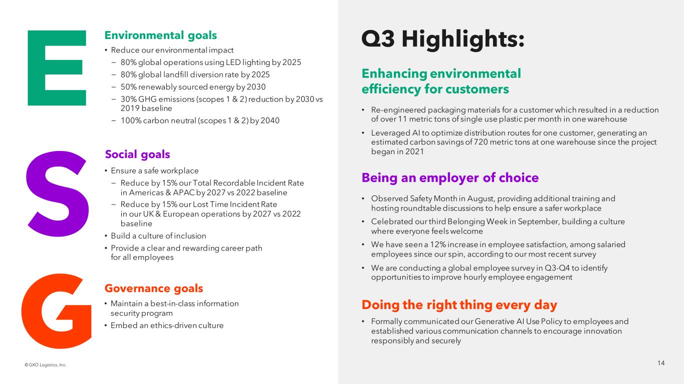 14©GXO Logistics, Inc.© GXO Logistics, Inc. Q3 Highlights: • Reduce our environmental impact − 80% global operations using LED lighting by 2025 − 80% global landfill diversion rate by 2025 − 50% renewably sourced energy by 2030 − 30% GHG emissions (scopes 1 & 2) reduction by 2030 vs 2019 baseline − 100% carbon neutral (scopes 1 & 2) by 2040 • Ensure a safe workplace − Reduce by 15% our Total Recordable Incident Rate in Americas & APAC by 2027 vs 2022 baseline − Reduce by 15% our Lost Time Incident Rate in our UK & European operations by 2027 vs 2022 baseline • Build a culture of inclusion • Provide a clear and rewarding career path for all employees • Maintain a best-in-class information security program • Embed an ethics-driven culture Environmental goals Social goals Governance goals Enhancing environmental efficiency for customers • Re-engineered packaging materials for a customer which resulted in a reduction of over 11 metric tons of single use plastic per month in one warehouse • Leveraged AI to optimize distribution routes for one customer, generating an estimated carbon savings of 720 metric tons at one warehouse since the project began in 2021 Being an employer of choice • Observed Safety Month in August, providing additional training and hosting roundtable discussions to help ensure a safer workplace • Celebrated our third Belonging Week in September, building a culture where everyone feels welcome • We have seen a 12% increase in employee satisfaction, among salaried employees since our spin, according to our most recent survey • We are conducting a global employee survey in Q3-Q4 to identify opportunities to improve hourly employee engagement Doing the right thing every day • Formally communicated our Generative AI Use Policy to employees and established various communication channels to encourage innovation responsibly and securely