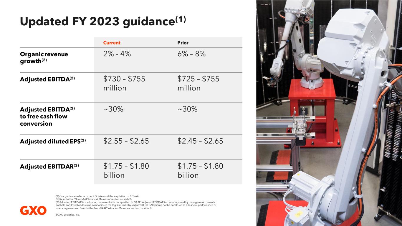 16©GXO Logistics, Inc. Updated FY 2023 guidance(1) Current Prior Organic revenue growth(2) 2% - 4% 6% – 8% Adjusted EBITDA(2) $730 – $755 million $725 – $755 million Adjusted EBITDA(2) to free cash flow conversion ~30% ~30% Adjusted diluted EPS(2) $2.55 – $2.65 $2.45 – $2.65 Adjusted EBITDAR(3) $1.75 – $1.80 billion $1.75 – $1.80 billion (1) Our guidance reflects current FX rates and the acquisition of PFSweb. (2) Refer to the ‘Non-GAAP Financial Measures’ section on slide 2. (3) Adjusted EBITDAR is a valuation measure that is not specified in GAAP. Adjusted EBITDAR is commonly used by management, research analysts and Investors to value companies in the logistics industry. Adjusted EBITDAR should not be construed as a financial performance or operating measure. Refer to the ‘Non-GAAP Valuation Measures’ section on slide 2.