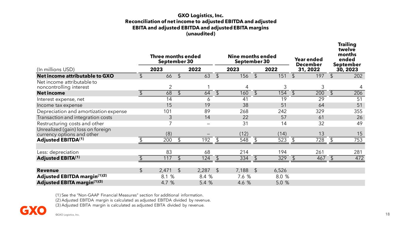 18©GXO Logistics, Inc. GXO Logistics, Inc. Reconciliation of net income to adjusted EBITDA and adjusted EBITA and adjusted EBITDA and adjusted EBITA margins (unaudited) Three months ended September 30 Nine months ended September 30 Year ended December 31, 2022 Trailing twelve months ended September 30, 2023(In millions USD) 2023 2022 2023 2022 Net income attributable to GXO $ 66 $ 63 $ 156 $ 151 $ 197 $ 202 Net income attributable to noncontrolling interest 2 1 4 3 3 4 Net income $ 68 $ 64 $ 160 $ 154 $ 200 $ 206 Interest expense, net 14 6 41 19 29 51 Income tax expense 15 19 38 51 64 51 Depreciation and amortization expense 101 89 268 242 329 355 Transaction and integration costs 3 14 22 57 61 26 Restructuring costs and other 7 — 31 14 32 49 Unrealized (gain) loss on foreign currency options and other (8) — (12) (14) 13 15 Adjusted EBITDA(1) $ 200 $ 192 $ 548 $ 523 $ 728 $ 753 Less: depreciation 83 68 214 194 261 281 Adjusted EBITA(1) $ 117 $ 124 $ 334 $ 329 $ 467 $ 472 Revenue $ 2,471 $ 2,287 $ 7,188 $ 6,526 Adjusted EBITDA margin(1)(2) 8.1 % 8.4 % 7.6 % 8.0 % Adjusted EBITA margin(1)(3) 4.7 % 5.4 % 4.6 % 5.0 % (1) See the “Non-GAAP Financial Measures” section for additional information. (2) Adjusted EBITDA margin is calculated as adjusted EBITDA divided by revenue. (3) Adjusted EBITA margin is calculated as adjusted EBITA divided by revenue.