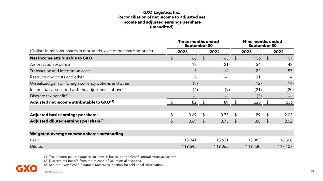 19©GXO Logistics, Inc. GXO Logistics, Inc. Reconciliation of net income to adjusted net income and adjusted earnings per share (unaudited) Three months ended September 30 Nine months ended September 30 (Dollars in millions, shares in thousands, except per share amounts) 2023 2022 2023 2022 Net income attributable to GXO $ 66 $ 63 $ 156 $ 151 Amortization expense 18 21 54 48 Transaction and integration costs 3 14 22 57 Restructuring costs and other 7 — 31 14 Unrealized gain on foreign currency options and other (8) — (12) (14) Income tax associated with the adjustments above(1) (4) (9) (21) (20) Discrete tax benefit(2) — — (5) — Adjusted net income attributable to GXO(3) $ 82 $ 89 $ 225 $ 236 Adjusted basic earnings per share(3) $ 0.69 $ 0.75 $ 1.89 $ 2.03 Adjusted diluted earnings per share(3) $ 0.69 $ 0.75 $ 1.88 $ 2.02 Weighted-average common shares outstanding Basic 118,941 118,621 118,883 116,508 Diluted 119,645 119,065 119,430 117,107 (1) The income tax rate applied to items is based on the GAAP annual effective tax rate. (2) Discrete tax benefit from the release of valuation allowances. (3) See the “Non-GAAP Financial Measures” section for additional information.
