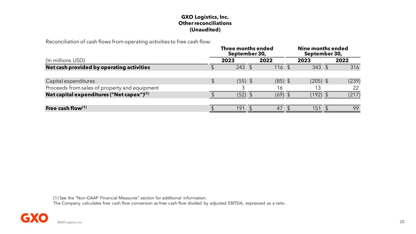 20©GXO Logistics, Inc. GXO Logistics, Inc. Other reconciliations (Unaudited) Reconciliation of cash flows from operating activities to free cash flow: Three months ended September 30, Nine months ended September 30, (In millions USD) 2023 2022 2023 2022 Net cash provided by operating activities $ 243 $ 116 $ 343 $ 316 Capital expenditures $ (55) $ (85) $ (205) $ (239) Proceeds from sales of property and equipment 3 16 13 22 Net capital expenditures (“Net capex”)(1) $ (52) $ (69) $ (192) $ (217) Free cash flow(1) $ 191 $ 47 $ 151 $ 99 (1) See the “Non-GAAP Financial Measures” section for additional information. The Company calculates free cash flow conversion as free cash flow divided by adjusted EBITDA, expressed as a ratio .