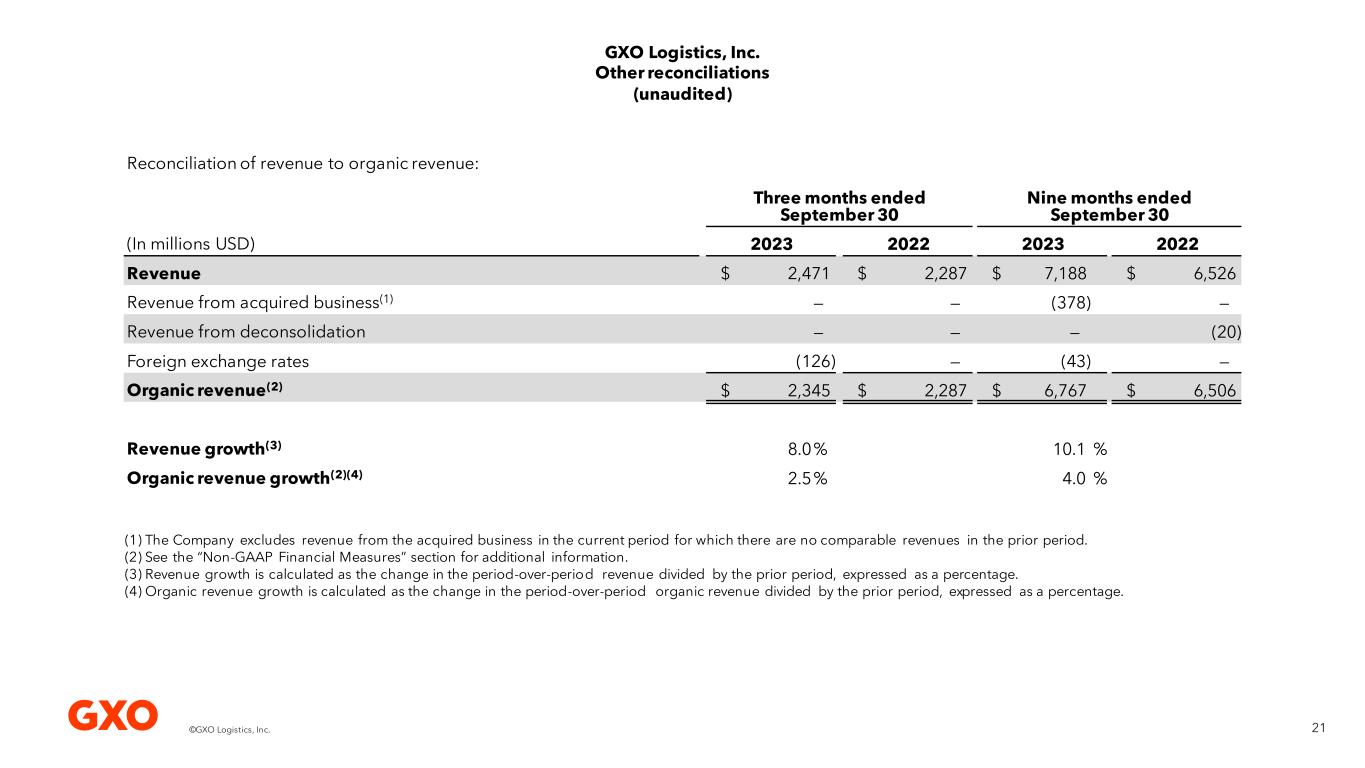21©GXO Logistics, Inc. GXO Logistics, Inc. Other reconciliations (unaudited) Reconciliation of revenue to organic revenue: Three months ended September 30 Nine months ended September 30 (In millions USD) 2023 2022 2023 2022 Revenue $ 2,471 $ 2,287 $ 7,188 $ 6,526 Revenue from acquired business(1) — — (378) — Revenue from deconsolidation — — — (20) Foreign exchange rates (126) — (43) — Organic revenue(2) $ 2,345 $ 2,287 $ 6,767 $ 6,506 Revenue growth(3) 8.0% 10.1 % Organic revenue growth(2)(4) 2.5% 4.0 % (1) The Company excludes revenue from the acquired business in the current period for which there are no comparable revenues in the prior period. (2) See the “Non-GAAP Financial Measures” section for additional information. (3) Revenue growth is calculated as the change in the period-over-period revenue divided by the prior period, expressed as a percentage. (4) Organic revenue growth is calculated as the change in the period-over-period organic revenue divided by the prior period, expressed as a percentage.
