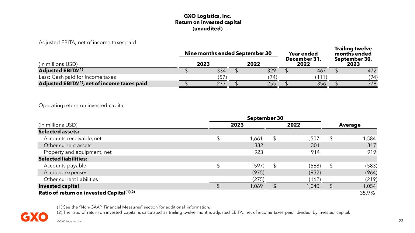 23©GXO Logistics, Inc. Adjusted EBITA, net of income taxes paid Nine months ended September 30 Year ended December 31, 2022 Trailing twelve months ended September 30, 2023(In millions USD) 2023 2022 Adjusted EBITA(1) $ 334 $ 329 $ 467 $ 472 Less: Cash paid for income taxes (57) (74) (111) (94) Adjusted EBITA(1), net of income taxes paid $ 277 $ 255 $ 356 $ 378 Operating return on invested capital September 30 (In millions USD) 2023 2022 Average Selected assets: Accounts receivable, net $ 1,661 $ 1,507 $ 1,584 Other current assets 332 301 317 Property and equipment, net 923 914 919 Selected liabilities: Accounts payable $ (597) $ (568) $ (583) Accrued expenses (975) (952) (964) Other current liabilities (275) (162) (219) Invested capital $ 1,069 $ 1,040 $ 1,054 Ratio of return on invested Capital(1)(2) 35.9% GXO Logistics, Inc. Return on invested capital (unaudited) (1) See the “Non-GAAP Financial Measures” section for additional information. (2) The ratio of return on invested capital is calculated as trailing twelve months adjusted EBITA, net of income taxes paid, divided by invested capital.