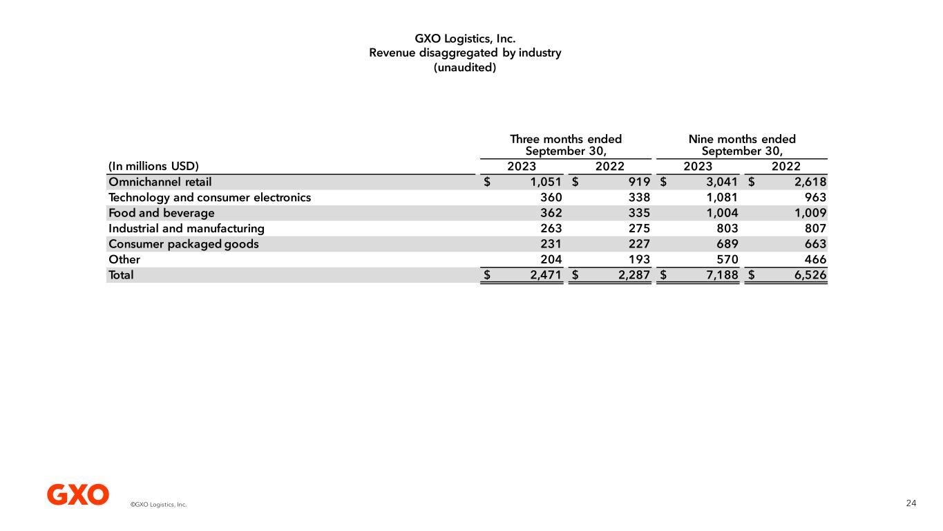 24©GXO Logistics, Inc. GXO Logistics, Inc. Revenue disaggregated by industry (unaudited) Three months ended September 30, Nine months ended September 30, (In millions USD) 2023 2022 2023 2022 Omnichannel retail $ 1,051 $ 919 $ 3,041 $ 2,618 Technology and consumer electronics 360 338 1,081 963 Food and beverage 362 335 1,004 1,009 Industrial and manufacturing 263 275 803 807 Consumer packaged goods 231 227 689 663 Other 204 193 570 466 Total $ 2,471 $ 2,287 $ 7,188 $ 6,526