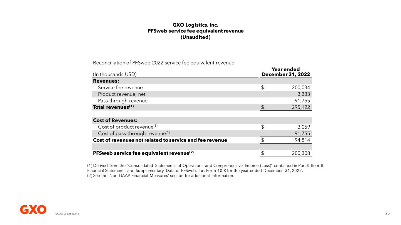 25©GXO Logistics, Inc. GXO Logistics, Inc. PFSweb service fee equivalent revenue (Unaudited) Reconciliation of PFSweb 2022 service fee equivalent revenue (In thousands USD) Year ended December 31, 2022 Revenues: Service fee revenue $ 200,034 Product revenue, net 3,333 Pass-through revenue 91,755 Total revenues(1) $ 295,122 Cost of Revenues: Cost of product revenue(1) $ 3,059 Cost of pass-through revenue(1) 91,755 Cost of revenues not related to service and fee revenue $ 94,814 PFSweb service fee equivalent revenue(2) $ 200,308 (1) Derived from the “Consolidated Statements of Operations and Comprehensive Income (Loss)” contained in Part II, Item 8. Financial Statements and Supplementary Data of PFSweb, Inc. Form 10-K for the year ended December 31, 2022. (2) See the ‘Non-GAAP Financial Measures’ section for additional information.