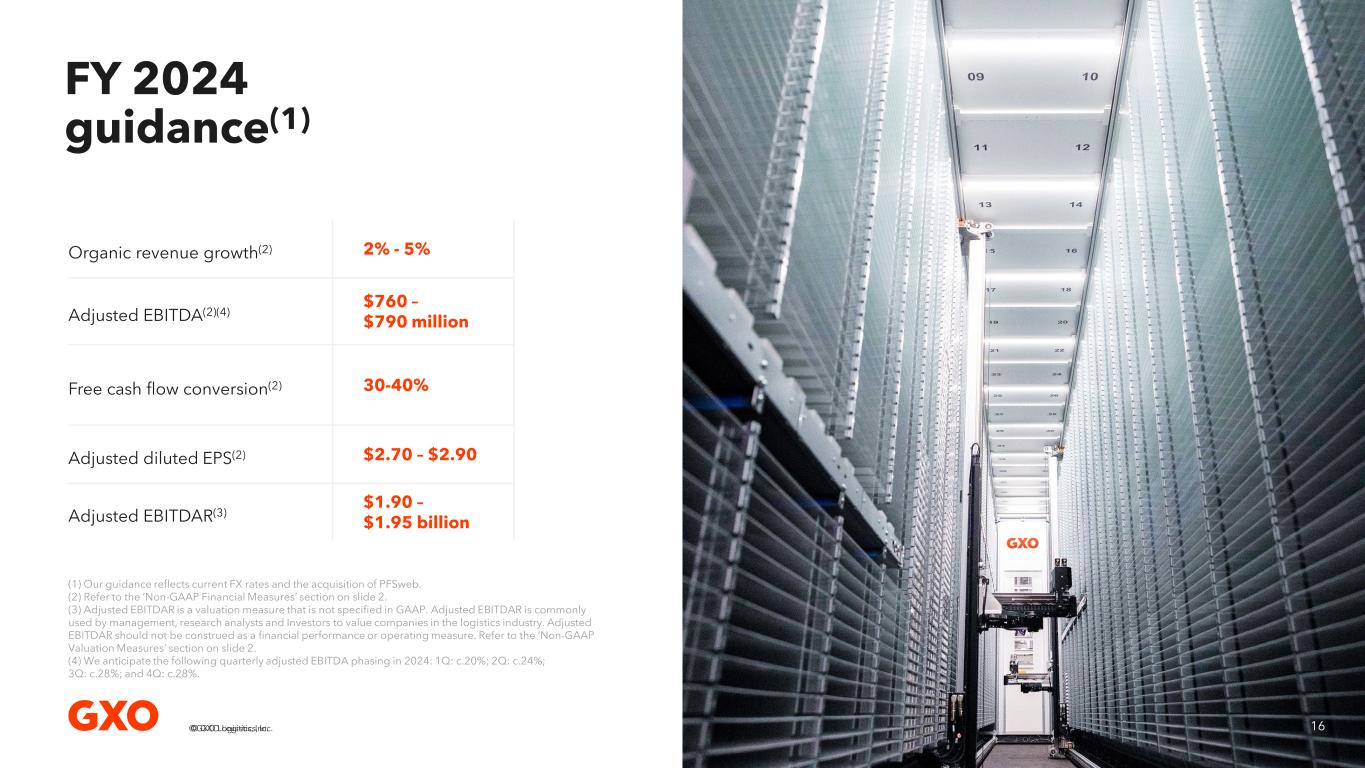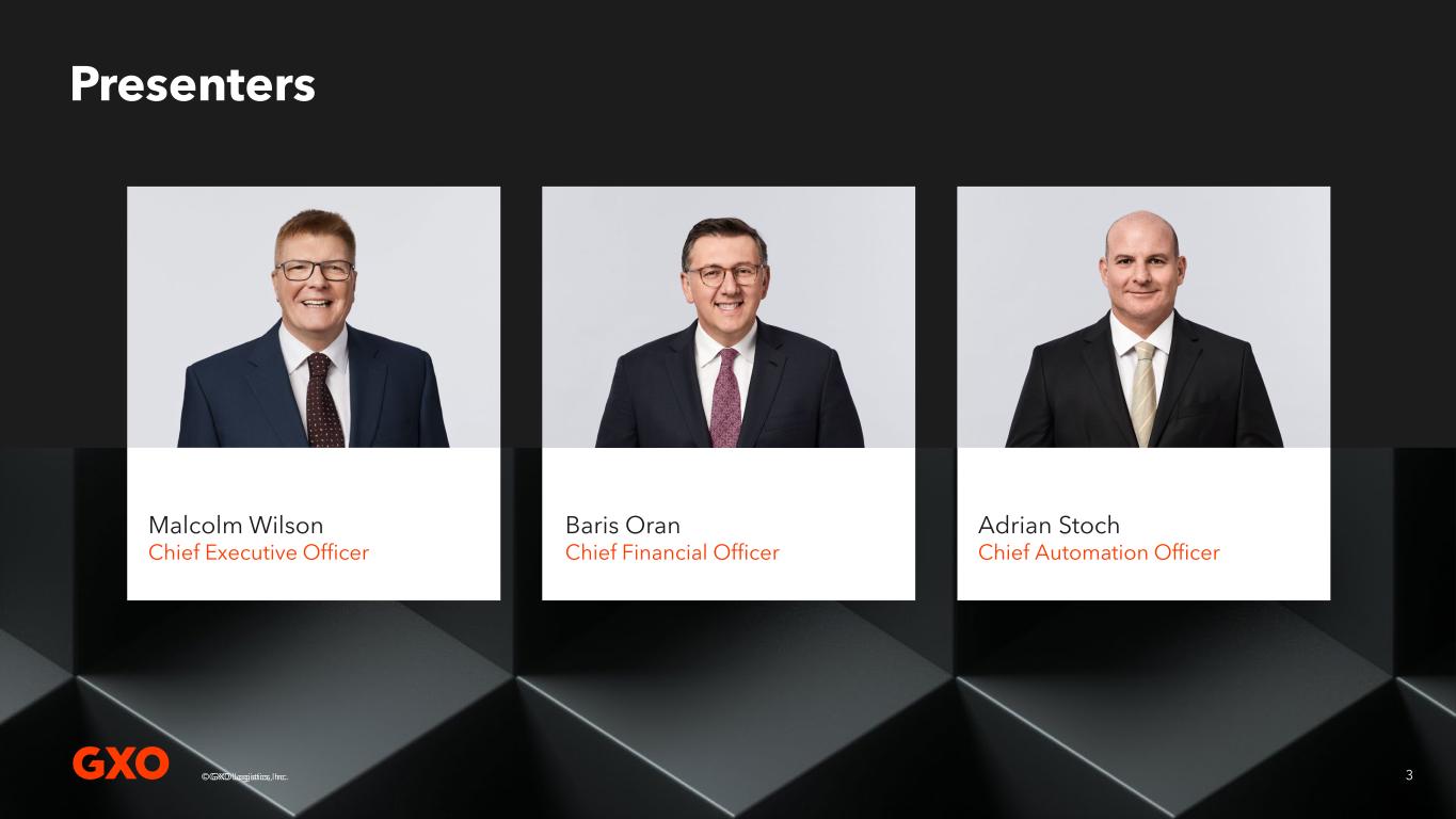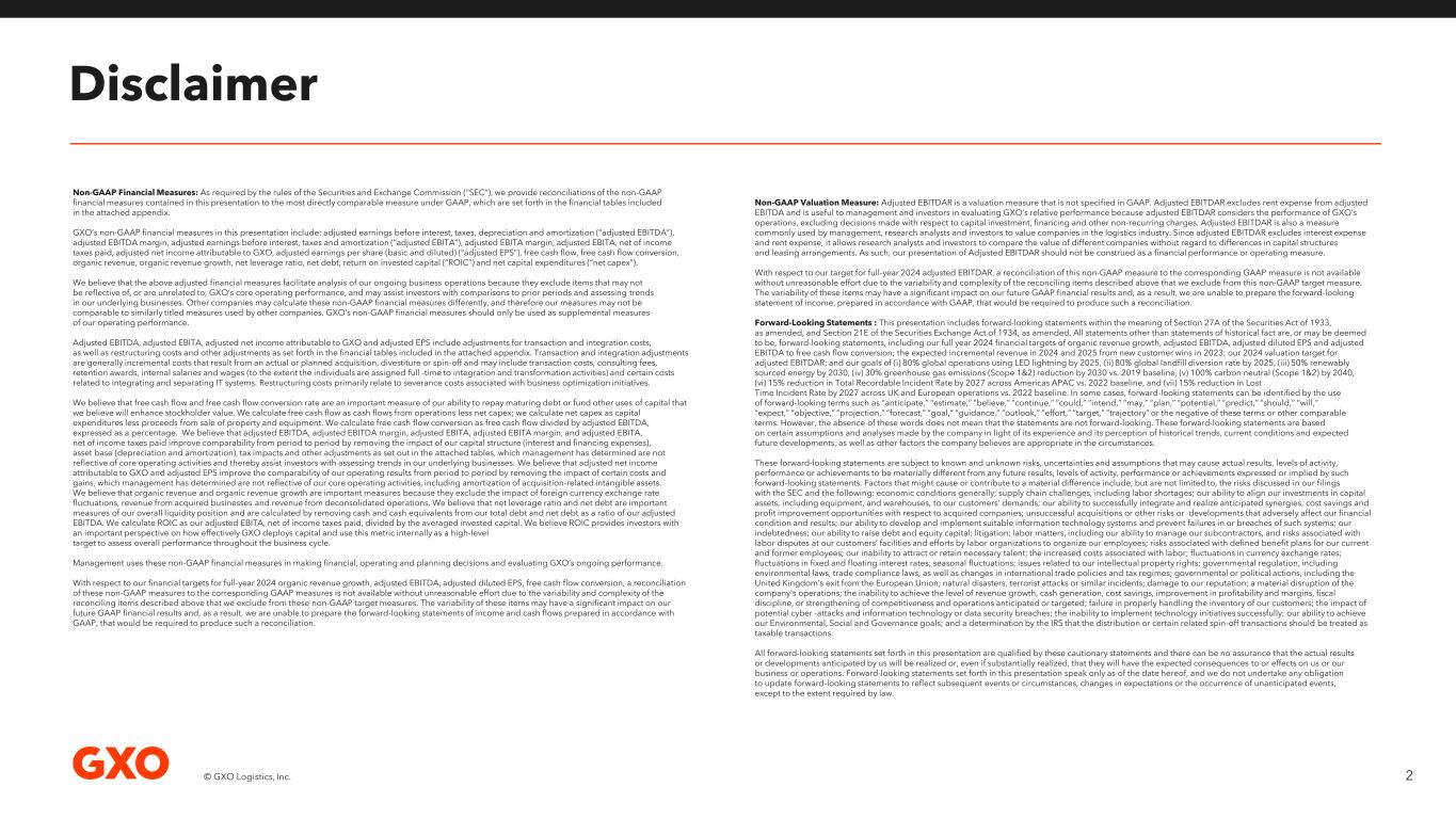 © GXO Logistics, Inc. Disclaimer 2 Non-GAAP Financial Measures: As required by the rules of the Securities and Exchange Commission (“SEC”), we provide reconciliations of the non-GAAP financial measures contained in this presentation to the most directly comparable measure under GAAP, which are set forth in the financial tables included in the attached appendix. GXO’s non-GAAP financial measures in this presentation include: adjusted earnings before interest, taxes, depreciation and amortization (“adjusted EBITDA”), adjusted EBITDA margin, adjusted earnings before interest, taxes and amortization (“adjusted EBITA”), adjusted EBITA margin, adjusted EBITA, net of income taxes paid, adjusted net income attributable to GXO, adjusted earnings per share (basic and diluted) (“adjusted EPS”), free cash flow, free cash flow conversion, organic revenue, organic revenue growth, net leverage ratio, net debt, return on invested capital (“ROIC”) and net capital expenditures (“net capex”). We believe that the above adjusted financial measures facilitate analysis of our ongoing business operations because they exclude items that may not be reflective of, or are unrelated to, GXO’s core operating performance, and may assist investors with comparisons to prior periods and assessing trends in our underlying businesses. Other companies may calculate these non-GAAP financial measures differently, and therefore our measures may not be comparable to similarly titled measures used by other companies. GXO’s non-GAAP financial measures should only be used as supplemental measures of our operating performance. Adjusted EBITDA, adjusted EBITA, adjusted net income attributable to GXO and adjusted EPS include adjustments for transaction and integration costs, as well as restructuring costs and other adjustments as set forth in the financial tables included in the attached appendix. Transaction and integration adjustments are generally incremental costs that result from an actual or planned acquisition, divestiture or spin-off and may include transaction costs, consulting fees, retention awards, internal salaries and wages (to the extent the individuals are assigned full -time to integration and transformation activities) and certain costs related to integrating and separating IT systems. Restructuring costs primarily relate to severance costs associated with business optimization initiatives. We believe that free cash flow and free cash flow conversion rate are an important measure of our ability to repay maturing debt or fund other uses of capital that we believe will enhance stockholder value. We calculate free cash flow as cash flows from operations less net capex; we calculate net capex as capital expenditures less proceeds from sale of property and equipment. We calculate free cash flow conversion as free cash flow divided by adjusted EBITDA, expressed as a percentage. We believe that adjusted EBITDA, adjusted EBITDA margin, adjusted EBITA, adjusted EBITA margin, and adjusted EBITA, net of income taxes paid improve comparability from period to period by removing the impact of our capital structure (interest and financing expenses), asset base (depreciation and amortization), tax impacts and other adjustments as set out in the attached tables, which management has determined are not reflective of core operating activities and thereby assist investors with assessing trends in our underlying businesses. We believe that adjusted net income attributable to GXO and adjusted EPS improve the comparability of our operating results from period to period by removing the impact of certain costs and gains, which management has determined are not reflective of our core operating activities, including amortization of acquisition-related intangible assets. We believe that organic revenue and organic revenue growth are important measures because they exclude the impact of foreign currency exchange rate fluctuations, revenue from acquired businesses and revenue from deconsolidated operations. We believe that net leverage ratio and net debt are important measures of our overall liquidity position and are calculated by removing cash and cash equivalents from our total debt and net debt as a ratio of our adjusted EBITDA. We calculate ROIC as our adjusted EBITA, net of income taxes paid, divided by the averaged invested capital. We believe ROIC provides investors with an important perspective on how effectively GXO deploys capital and use this metric internally as a high-level target to assess overall performance throughout the business cycle. Management uses these non-GAAP financial measures in making financial, operating and planning decisions and evaluating GXO’s ongoing performance. With respect to our financial targets for full-year 2024 organic revenue growth, adjusted EBITDA, adjusted diluted EPS, free cash flow conversion, a reconciliation of these non-GAAP measures to the corresponding GAAP measures is not available without unreasonable effort due to the variability and complexity of the reconciling items described above that we exclude from these non-GAAP target measures. The variability of these items may have a significant impact on our future GAAP financial results and, as a result, we are unable to prepare the forward-looking statements of income and cash flows prepared in accordance with GAAP, that would be required to produce such a reconciliation. Non-GAAP Valuation Measure: Adjusted EBITDAR is a valuation measure that is not specified in GAAP. Adjusted EBITDAR excludes rent expense from adjusted EBITDA and is useful to management and investors in evaluating GXO’s relative performance because adjusted EBITDAR considers the performance of GXO’s operations, excluding decisions made with respect to capital investment, financing and other non-recurring charges. Adjusted EBITDAR is also a measure commonly used by management, research analysts and investors to value companies in the logi