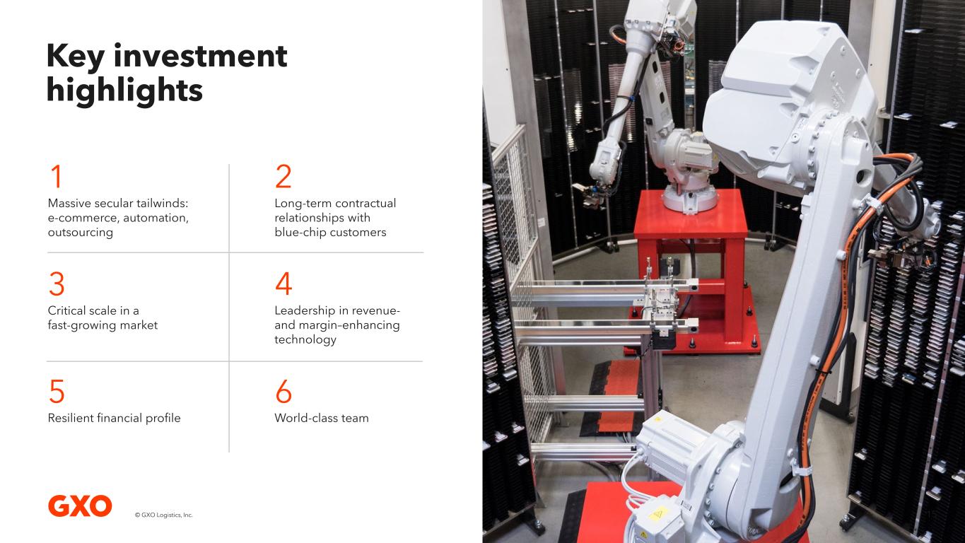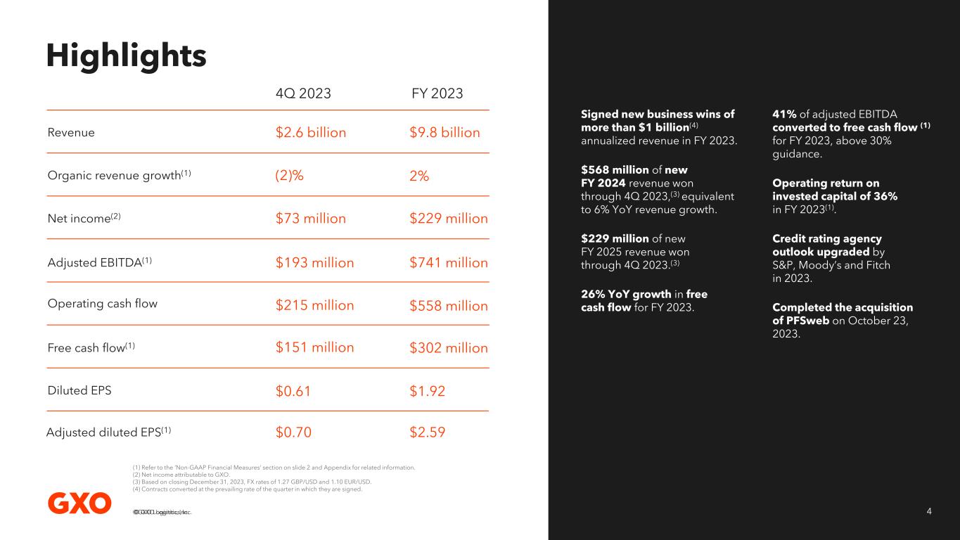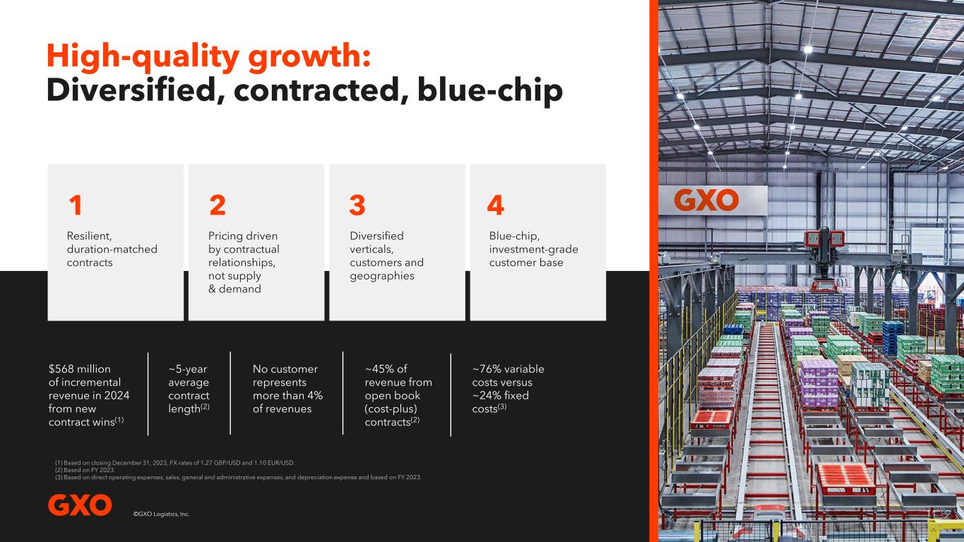 © GXO Logistics, Inc. Disclaimer 2 Non-GAAP Financial Measures: As required by the rules of the Securities and Exchange Commission (“SEC”), we provide reconciliations of the non-GAAP financial measures contained in this presentation to the most directly comparable measure under GAAP, which are set forth in the financial tables included in the attached appendix. GXO’s non-GAAP financial measures in this presentation include: adjusted earnings before interest, taxes, depreciation and amortization (“adjusted EBITDA”), adjusted EBITDA margin, adjusted earnings before interest, taxes and amortization (“adjusted EBITA”), adjusted EBITA margin, adjusted EBITA, net of income taxes paid, adjusted net income attributable to GXO, adjusted earnings per share (basic and diluted) (“adjusted EPS”), free cash flow, free cash flow conversion, organic revenue, organic revenue growth, net leverage ratio, net debt, return on invested capital (“ROIC”) and net capital expenditures (“net capex”). We believe that the above adjusted financial measures facilitate analysis of our ongoing business operations because they exclude items that may not be reflective of, or are unrelated to, GXO’s core operating performance, and may assist investors with comparisons to prior periods and assessing trends in our underlying businesses. Other companies may calculate these non-GAAP financial measures differently, and therefore our measures may not be comparable to similarly titled measures used by other companies. GXO’s non-GAAP financial measures should only be used as supplemental measures of our operating performance. Adjusted EBITDA, adjusted EBITA, adjusted net income attributable to GXO and adjusted EPS include adjustments for transaction and integration costs, as well as restructuring costs and other adjustments as set forth in the financial tables included in the attached appendix. Transaction and integration adjustments are generally incremental costs that result from an actual or planned acquisition, divestiture or spin-off and may include transaction costs, consulting fees, retention awards, internal salaries and wages (to the extent the individuals are assigned full -time to integration and transformation activities) and certain costs related to integrating and separating IT systems. Restructuring costs primarily relate to severance costs associated with business optimization initiatives. We believe that free cash flow and free cash flow conversion rate are an important measure of our ability to repay maturing debt or fund other uses of capital that we believe will enhance stockholder value. We calculate free cash flow as cash flows from operations less net capex; we calculate net capex as capital expenditures less proceeds from sale of property and equipment. We calculate free cash flow conversion as free cash flow divided by adjusted EBITDA, expressed as a percentage. We believe that adjusted EBITDA, adjusted EBITDA margin, adjusted EBITA, adjusted EBITA margin, and adjusted EBITA, net of income taxes paid improve comparability from period to period by removing the impact of our capital structure (interest and financing expenses), asset base (depreciation and amortization), tax impacts and other adjustments as set out in the attached tables, which management has determined are not reflective of core operating activities and thereby assist investors with assessing trends in our underlying businesses. We believe that adjusted net income attributable to GXO and adjusted EPS improve the comparability of our operating results from period to period by removing the impact of certain costs and gains, which management has determined are not reflective of our core operating activities, including amortization of acquisition-related intangible assets. We believe that organic revenue and organic revenue growth are important measures because they exclude the impact of foreign currency exchange rate fluctuations, revenue from acquired businesses and revenue from deconsolidated operations. We believe that net leverage ratio and net debt are important measures of our overall liquidity position and are calculated by removing cash and cash equivalents from our total debt and net debt as a ratio of our adjusted EBITDA. We calculate ROIC as our adjusted EBITA, net of income taxes paid, divided by the averaged invested capital. We believe ROIC provides investors with an important perspective on how effectively GXO deploys capital and use this metric internally as a high-level target to assess overall performance throughout the business cycle. Management uses these non-GAAP financial measures in making financial, operating and planning decisions and evaluating GXO’s ongoing performance. With respect to our financial targets for full-year 2024 organic revenue growth, adjusted EBITDA, adjusted diluted EPS, free cash flow conversion, a reconciliation of these non-GAAP measures to the corresponding GAAP measures is not available without unreasonable effort due to the variability and complexity of the reconciling items described above that we exclude from these non-GAAP target measures. The variability of these items may have a significant impact on our future GAAP financial results and, as a result, we are unable to prepare the forward-looking statements of income and cash flows prepared in accordance with GAAP, that would be required to produce such a reconciliation. Non-GAAP Valuation Measure: Adjusted EBITDAR is a valuation measure that is not specified in GAAP. Adjusted EBITDAR excludes rent expense from adjusted EBITDA and is useful to management and investors in evaluating GXO’s relative performance because adjusted EBITDAR considers the performance of GXO’s operations, excluding decisions made with respect to capital investment, financing and other non-recurring charges. Adjusted EBITDAR is also a measure commonly used by management, research analysts and investors to value companies in the logi