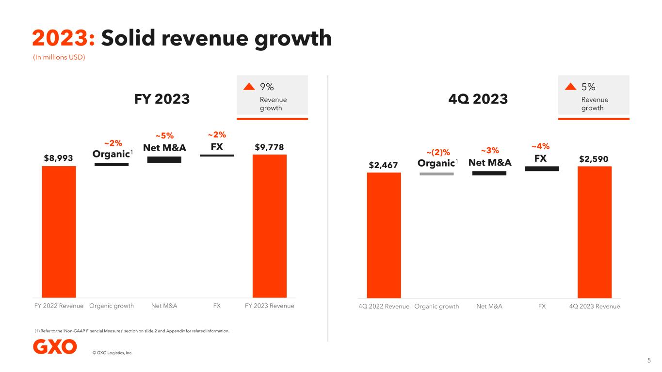 © GXO Logistics, Inc. Highlights 4 Revenue Organic revenue growth(1) Net income(2) Adjusted EBITDA(1) Signed new business wins of more than $1 billion(4) annualized revenue in FY 2023. $568 million of new FY 2024 revenue won through 4Q 2023,(3) equivalent to 6% YoY revenue growth. $229 million of new FY 2025 revenue won through 4Q 2023.(3) 26% YoY growth in free cash flow for FY 2023. 41% of adjusted EBITDA converted to free cash flow (1) for FY 2023, above 30% guidance. Operating return on invested capital of 36% in FY 2023(1). Credit rating agency outlook upgraded by S&P, Moody’s and Fitch in 2023. Completed the acquisition of PFSweb on October 23, 2023. Free cash flow(1) Operating cash flow 4Q 2023 FY 2023 $9.8 billion 2% $229 million $741 million $302 million $558 million GXO Logistics, Inc. $2.6 billion (2)% $73 million $193 million $215 million $151 million Diluted EPS $0.61 $1.92 Adjusted diluted EPS(1) $0.70 $2.59 (1) Refer to the ‘Non-GAAP Financial Measures’ section on slide 2 and Appendix for related information. (2) Net income attributable to GXO. (3) Based on closing December 31, 2023, FX rates of 1.27 GBP/USD and 1.10 EUR/USD. (4) Contracts converted at the prevailing rate of the quarter in which they are signed.