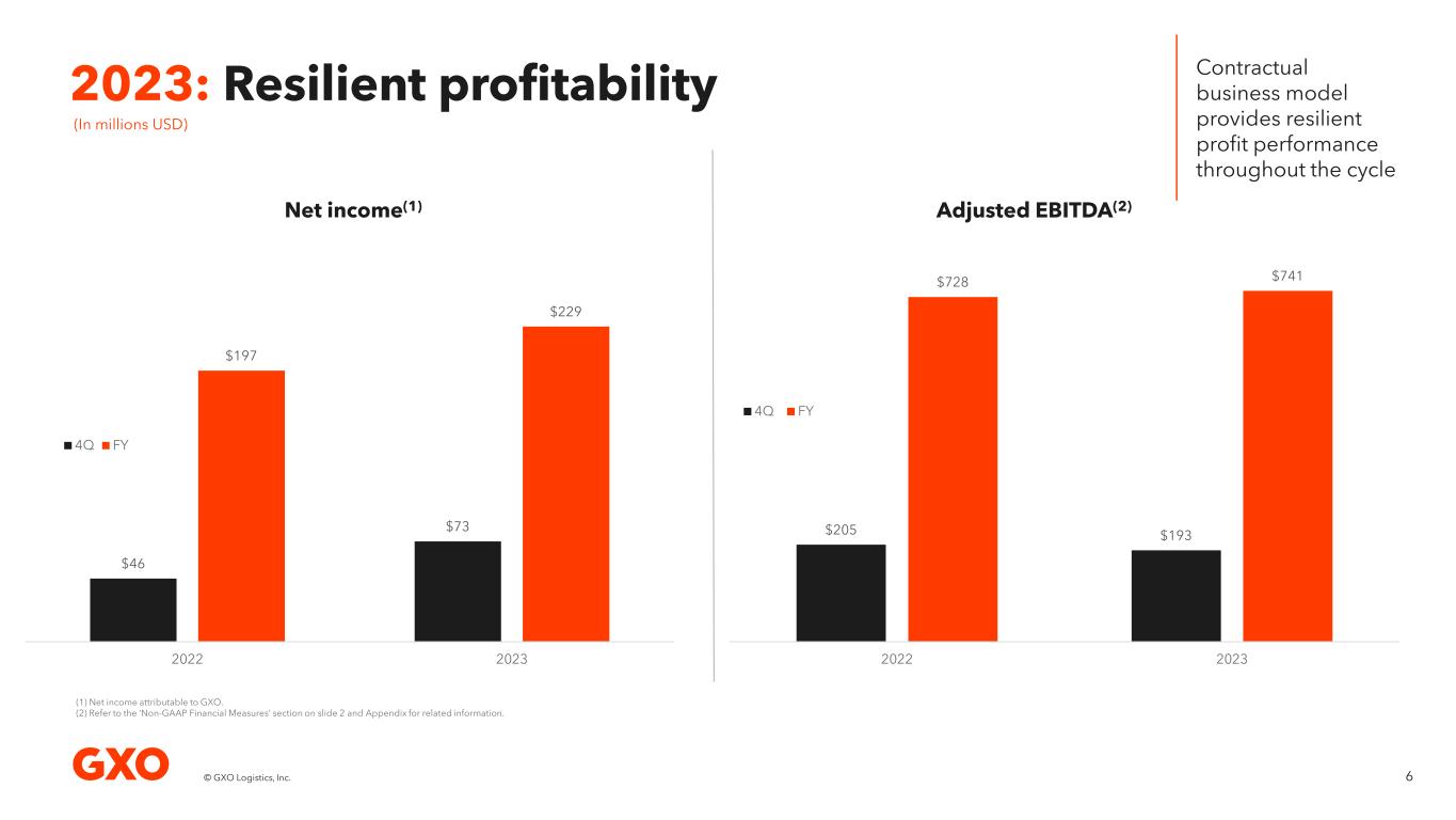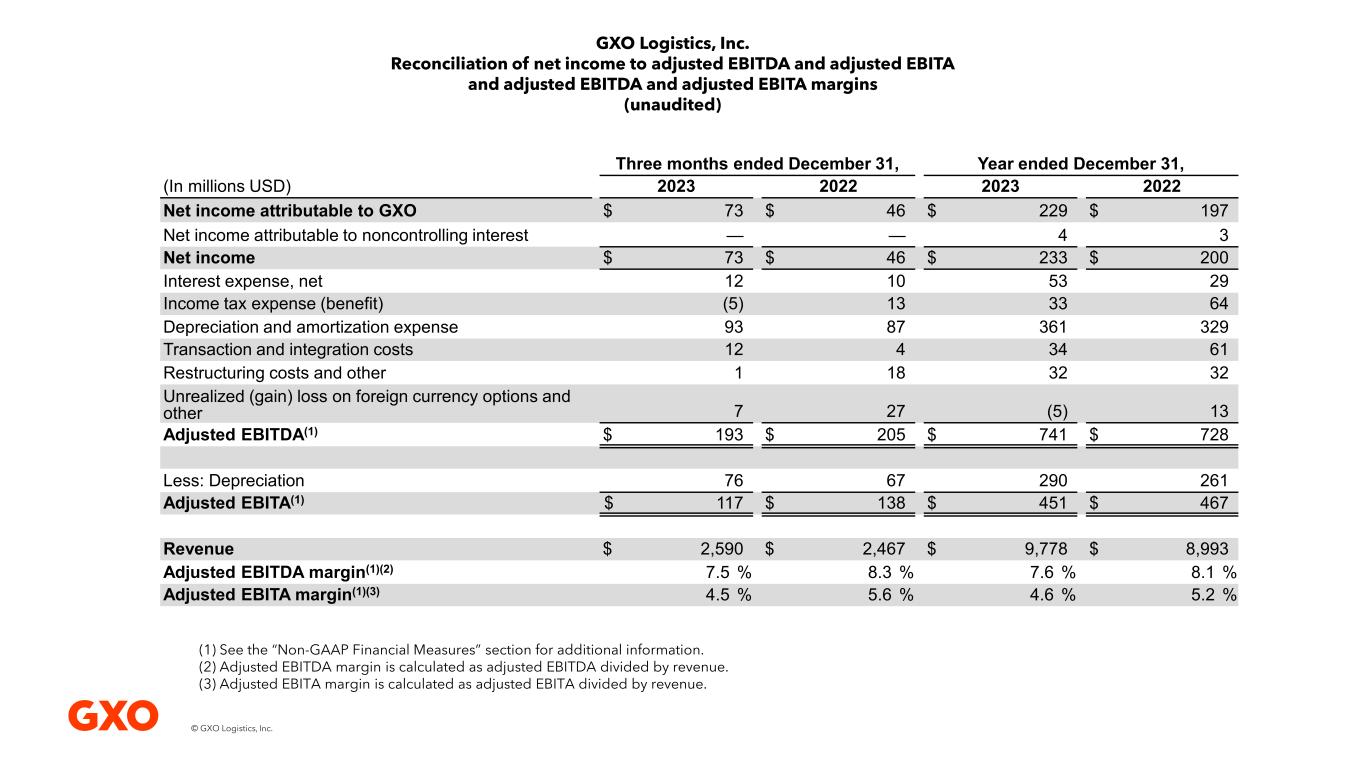© GXO Logistics, Inc. GXO Logistics, Inc. Reconciliation of net income to adjusted EBITDA and adjusted EBITA and adjusted EBITDA and adjusted EBITA margins (unaudited) Three months ended December 31, Year ended December 31, (In millions USD) 2023 2022 2023 2022 Net income attributable to GXO $ 73 $ 46 $ 229 $ 197 Net income attributable to noncontrolling interest — — 4 3 Net income $ 73 $ 46 $ 233 $ 200 Interest expense, net 12 10 53 29 Income tax expense (benefit) (5) 13 33 64 Depreciation and amortization expense 93 87 361 329 Transaction and integration costs 12 4 34 61 Restructuring costs and other 1 18 32 32 Unrealized (gain) loss on foreign currency options and other 7 27 (5) 13 Adjusted EBITDA(1) $ 193 $ 205 $ 741 $ 728 Less: Depreciation 76 67 290 261 Adjusted EBITA(1) $ 117 $ 138 $ 451 $ 467 Revenue $ 2,590 $ 2,467 $ 9,778 $ 8,993 Adjusted EBITDA margin(1)(2) 7.5 % 8.3 % 7.6 % 8.1 % Adjusted EBITA margin(1)(3) 4.5 % 5.6 % 4.6 % 5.2 % (1) See the “Non-GAAP Financial Measures” section for additional information. (2) Adjusted EBITDA margin is calculated as adjusted EBITDA divided by revenue. (3) Adjusted EBITA margin is calculated as adjusted EBITA divided by revenue.