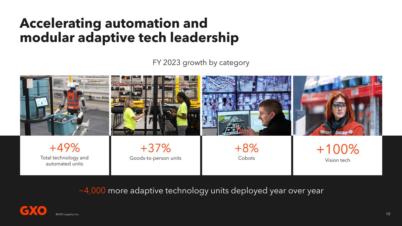 © GXO Logistics, Inc. (In millions USD) Expected incremental revenues won through 2023 FY 2023 contract wins by source(3) Signed new business wins of >$ 1billion(2) annualized revenue in 2023 Sites transferred from other 3PLs Sites set up to support customer growth Sites previously operated by customers in-house Won from competitors 32% 39% 29% New activity Outsourcing Strong new contract wins and outsourcing underpin 2024 and 2025 growth 9 FY 2022: 26% FY 2022: 43% FY 2022: 31% (1) Based on closing December 31, 2023, FX rates of 1.27 GBP/USD and 1.10 EUR/USD. (2) Contracts converted at the prevailing rate of the quarter in which they are signed. (3) Excludes PFSweb 0 100 200 300 400 500 600 2024 2025 Additional $229(1) signed for 2025 $568(1) signed for 2024