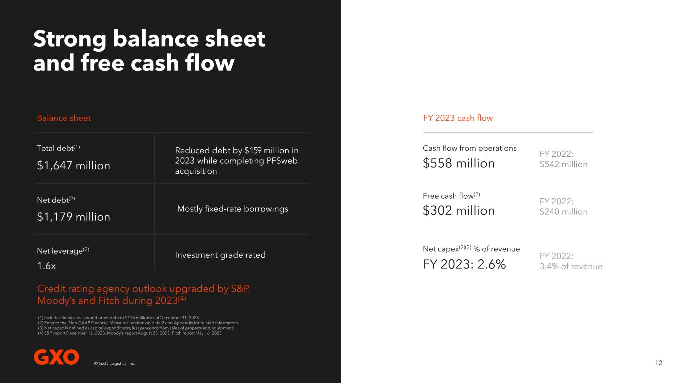 © GXO Logistics, Inc. GXO Logistics, Inc. Liquidity reconciliations (unaudited) Reconciliation of total debt and net debt: (In millions USD) December 31, 2023 Current debt $ 27 Long-term debt 1,620 Total debt $ 1,647 Less: Cash and cash equivalents (468) Net debt(1) $ 1,179 Reconciliation of total debt to net income attributable to GXO ratio: (In millions USD) December 31, 2023 Total debt $ 1,647 Net income attributable to GXO $ 229 Debt to net income attributable to GXO ratio 7.2x Reconciliation of net leverage ratio: (In millions USD) December 31, 2023 Net debt $ 1,179 Adjusted EBITDA(1) $ 741 Net leverage ratio(1) 1.6x (1) See the “Non-GAAP Financial Measures” section for additional information.