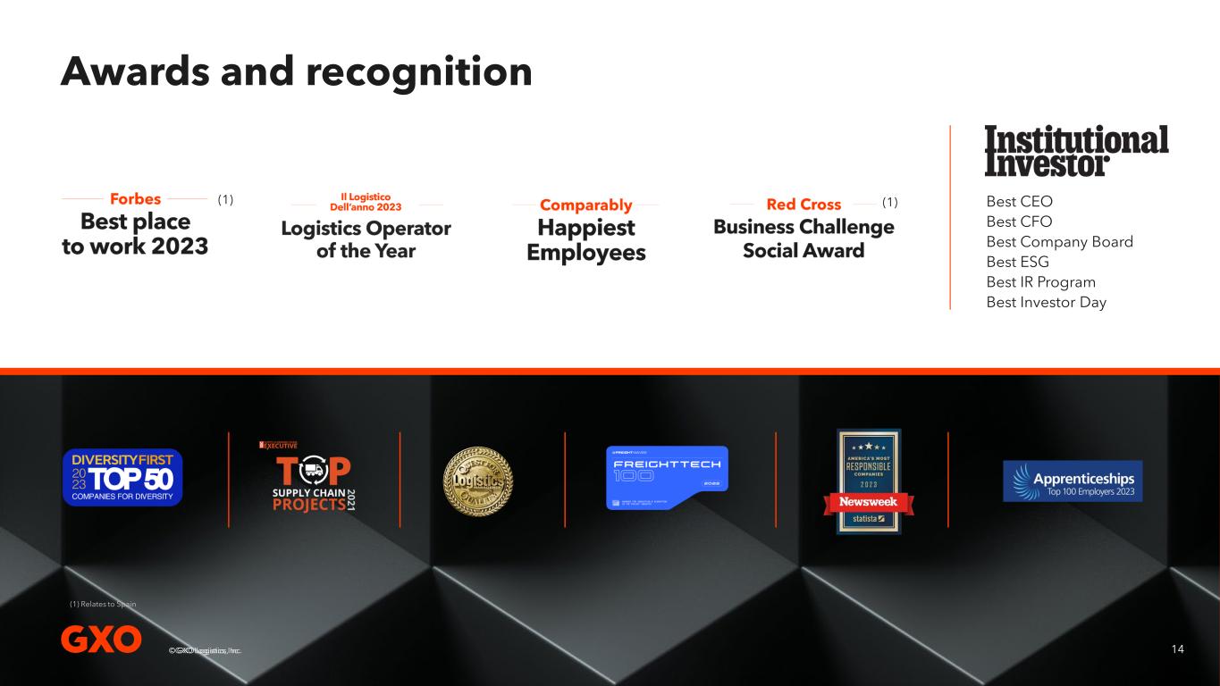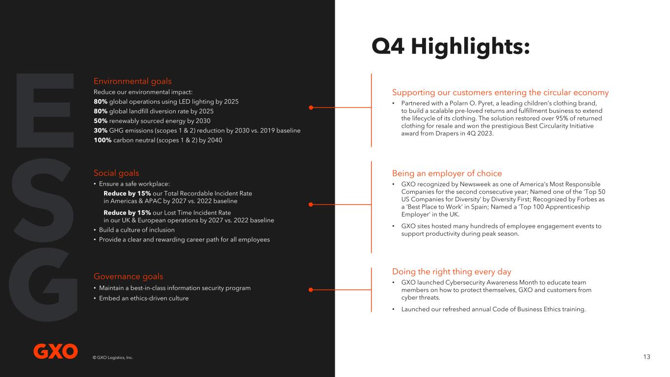 © GXO Logistics, Inc. GX Logistics, Inc. Environmental goals Reduce our environmental impact: 80% global operations using LED lighting by 2025 80% global landfill diversion rate by 2025 50% renewably sourced energy by 2030 30% GHG emissions (scopes 1 & 2) reduction by 2030 vs. 2019 baseline 100% carbon neutral (scopes 1 & 2) by 2040 Social goals • Ensure a safe workplace: Reduce by 15% our Total Recordable Incident Rate in Americas & APAC by 2027 vs. 2022 baseline Reduce by 15% our Lost Time Incident Rate in our UK & European operations by 2027 vs. 2022 baseline • Build a culture of inclusion • Provide a clear and rewarding career path for all employees Governance goals • Maintain a best-in-class information security program • Embed an ethics-driven culture Supporting our customers entering the circular economy • Partnered with a Polarn O. Pyret, a leading children’s clothing brand, to build a scalable pre-loved returns and fulfillment business to extend the lifecycle of its clothing. The solution restored over 95% of returned clothing for resale and won the prestigious Best Circularity Initiative award from Drapers in 4Q 2023. Being an employer of choice • GXO recognized by Newsweek as one of America’s Most Responsible Companies for the second consecutive year; Named one of the ‘Top 50 US Companies for Diversity’ by Diversity First; Recognized by Forbes as a ‘Best Place to Work’ in Spain; Named a ‘Top 100 Apprenticeship Employer’ in the UK. • GXO sites hosted many hundreds of employee engagement events to support productivity during peak season. Doing the right thing every day • GXO launched Cybersecurity Awareness Month to educate team members on how to protect themselves, GXO and customers from cyber threats. • Launched our refreshed annual Code of Business Ethics training. Q4 Highlights: 13