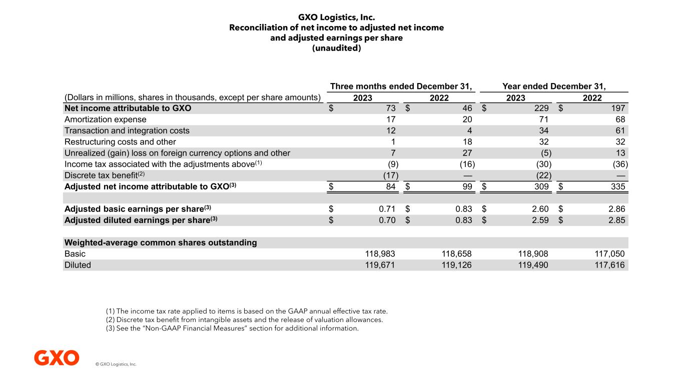 © GXO Logistics, Inc. GXO Logistics, Inc. Reconciliation of net income to adjusted net income and adjusted earnings per share (unaudited) Three months ended December 31, Year ended December 31, (Dollars in millions, shares in thousands, except per share amounts) 2023 2022 2023 2022 Net income attributable to GXO $ 73 $ 46 $ 229 $ 197 Amortization expense 17 20 71 68 Transaction and integration costs 12 4 34 61 Restructuring costs and other 1 18 32 32 Unrealized (gain) loss on foreign currency options and other 7 27 (5) 13 Income tax associated with the adjustments above(1) (9) (16) (30) (36) Discrete tax benefit(2) (17) — (22) — Adjusted net income attributable to GXO(3) $ 84 $ 99 $ 309 $ 335 Adjusted basic earnings per share(3) $ 0.71 $ 0.83 $ 2.60 $ 2.86 Adjusted diluted earnings per share(3) $ 0.70 $ 0.83 $ 2.59 $ 2.85 Weighted-average common shares outstanding Basic 118,983 118,658 118,908 117,050 Diluted 119,671 119,126 119,490 117,616 (1) The income tax rate applied to items is based on the GAAP annual effective tax rate. (2) Discrete tax benefit from intangible assets and the release of valuation allowances. (3) See the “Non-GAAP Financial Measures” section for additional information.