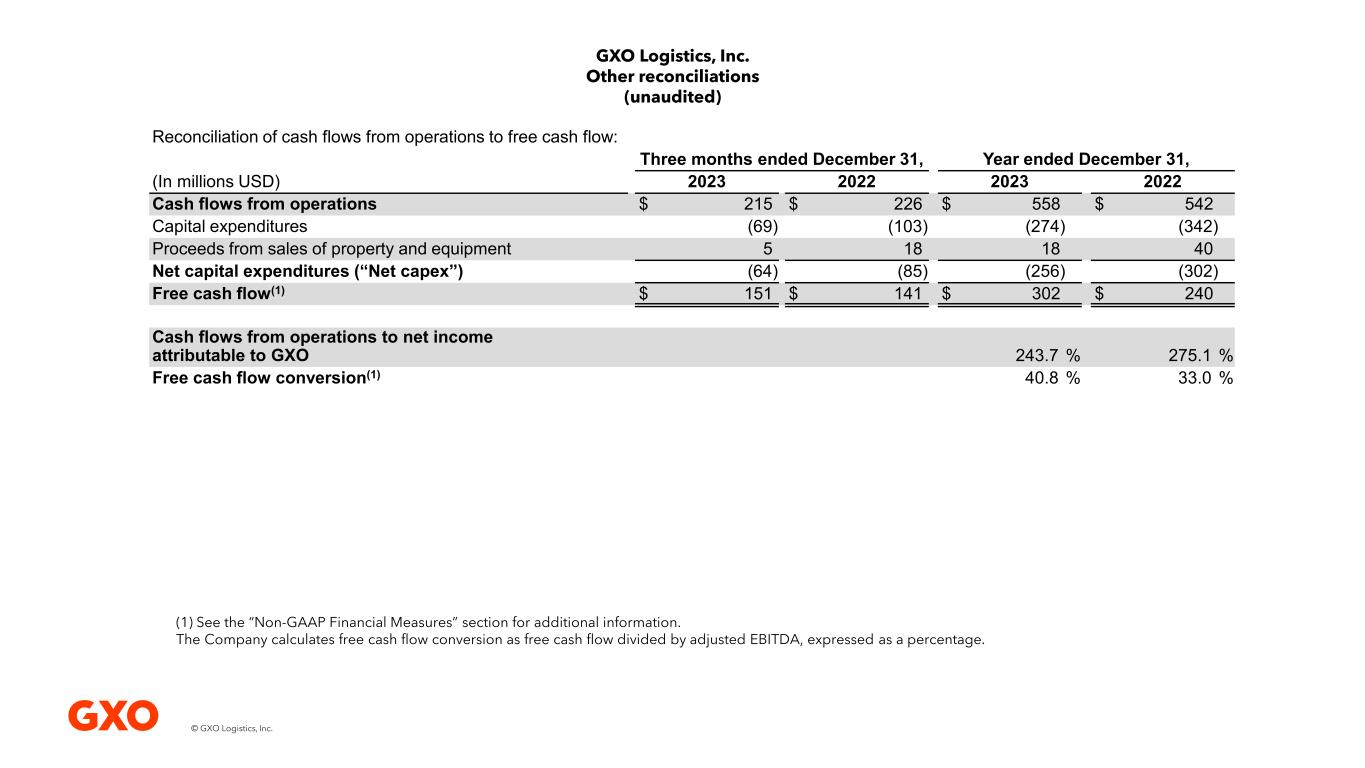 © GXO Logistics, Inc. GXO Logistics, Inc. Other reconciliations (unaudited) Reconciliation of cash flows from operations to free cash flow: Three months ended December 31, Year ended December 31, (In millions USD) 2023 2022 2023 2022 Cash flows from operations $ 215 $ 226 $ 558 $ 542 Capital expenditures (69) (103) (274) (342) Proceeds from sales of property and equipment 5 18 18 40 Net capital expenditures (“Net capex”) (64) (85) (256) (302) Free cash flow(1) $ 151 $ 141 $ 302 $ 240 Cash flows from operations to net income attributable to GXO 243.7 % 275.1 % Free cash flow conversion(1) 40.8 % 33.0 % (1) See the “Non-GAAP Financial Measures” section for additional information. The Company calculates free cash flow conversion as free cash flow divided by adjusted EBITDA, expressed as a percentage.