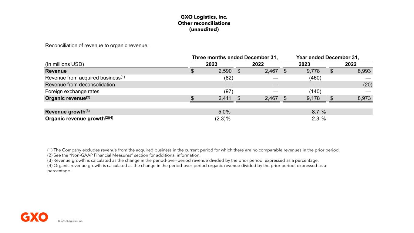 © GXO Logistics, Inc. GXO Logistics, Inc. Other reconciliations (unaudited) Reconciliation of revenue to organic revenue: Three months ended December 31, Year ended December 31, (In millions USD) 2023 2022 2023 2022 Revenue $ 2,590 $ 2,467 $ 9,778 $ 8,993 Revenue from acquired business(1) (82) — (460) — Revenue from deconsolidation — — — (20) Foreign exchange rates (97) — (140) — Organic revenue(2) $ 2,411 $ 2,467 $ 9,178 $ 8,973 Revenue growth(3) 5.0% 8.7 % Organic revenue growth(2)(4) (2.3)% 2.3 % (1) The Company excludes revenue from the acquired business in the current period for which there are no comparable revenues in the prior period. (2) See the “Non-GAAP Financial Measures” section for additional information. (3) Revenue growth is calculated as the change in the period-over-period revenue divided by the prior period, expressed as a percentage. (4) Organic revenue growth is calculated as the change in the period-over-period organic revenue divided by the prior period, expressed as a percentage.