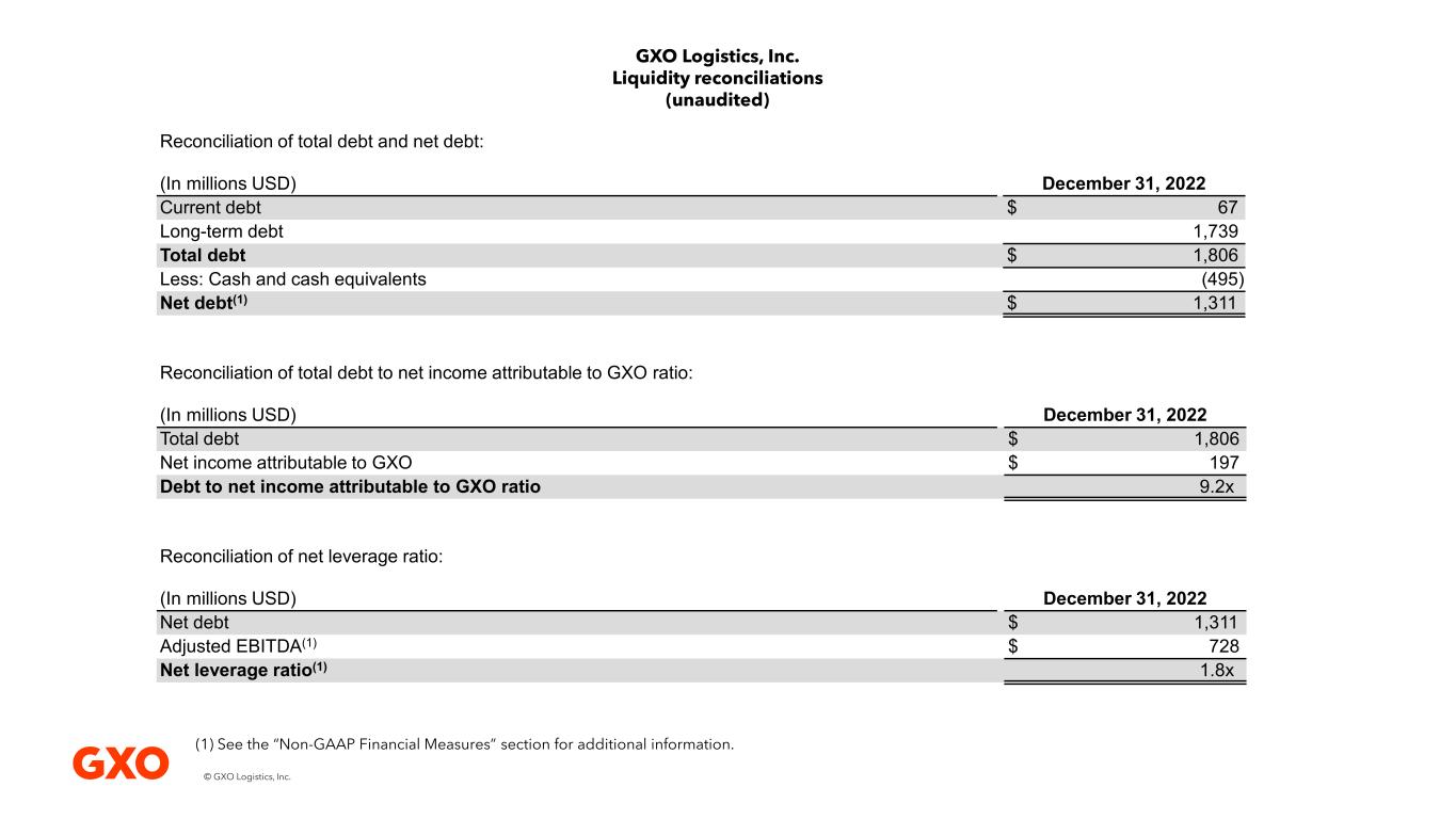 © GXO Logistics, Inc. GXO Logistics, Inc. Liquidity reconciliations (unaudited) Reconciliation of total debt and net debt: (In millions USD) December 31, 2022 Current debt $ 67 Long-term debt 1,739 Total debt $ 1,806 Less: Cash and cash equivalents (495) Net debt(1) $ 1,311 Reconciliation of total debt to net income attributable to GXO ratio: (In millions USD) December 31, 2022 Total debt $ 1,806 Net income attributable to GXO $ 197 Debt to net income attributable to GXO ratio 9.2x Reconciliation of net leverage ratio: (In millions USD) December 31, 2022 Net debt $ 1,311 Adjusted EBITDA(1) $ 728 Net leverage ratio(1) 1.8x (1) See the “Non-GAAP Financial Measures” section for additional information.