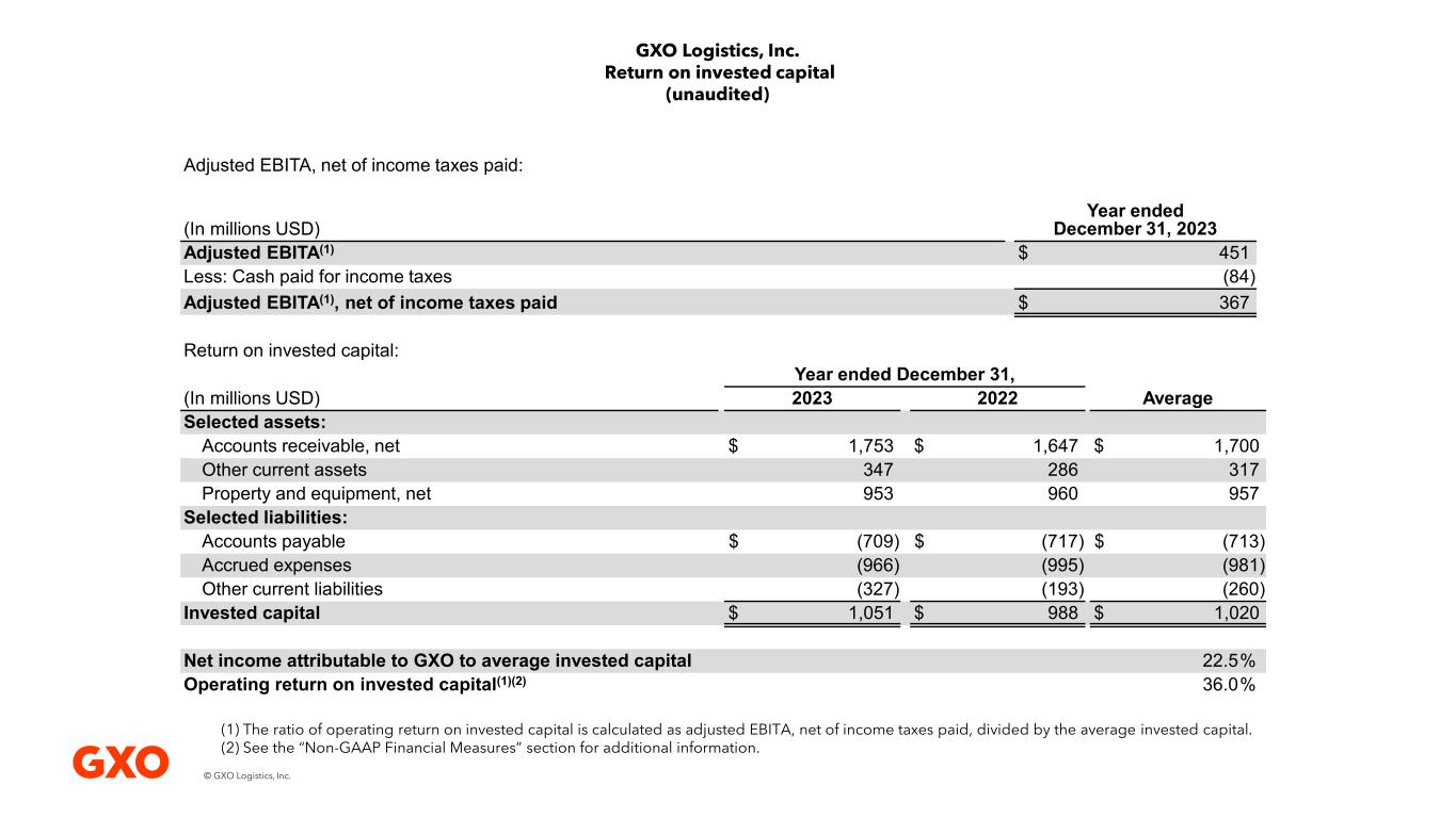 © GXO Logistics, Inc. Adjusted EBITA, net of income taxes paid: Year ended December 31, 2023(In millions USD) Adjusted EBITA(1) $ 451 Less: Cash paid for income taxes (84) Adjusted EBITA(1), net of income taxes paid $ 367 Return on invested capital: Year ended December 31, (In millions USD) 2023 2022 Average Selected assets: Accounts receivable, net $ 1,753 $ 1,647 $ 1,700 Other current assets 347 286 317 Property and equipment, net 953 960 957 Selected liabilities: Accounts payable $ (709) $ (717) $ (713) Accrued expenses (966) (995) (981) Other current liabilities (327) (193) (260) Invested capital $ 1,051 $ 988 $ 1,020 Net income attributable to GXO to average invested capital 22.5% Operating return on invested capital(1)(2) 36.0% GXO Logistics, Inc. Return on invested capital (unaudited) (1) The ratio of operating return on invested capital is calculated as adjusted EBITA, net of income taxes paid, divided by the average invested capital. (2) See the “Non-GAAP Financial Measures” section for additional information.