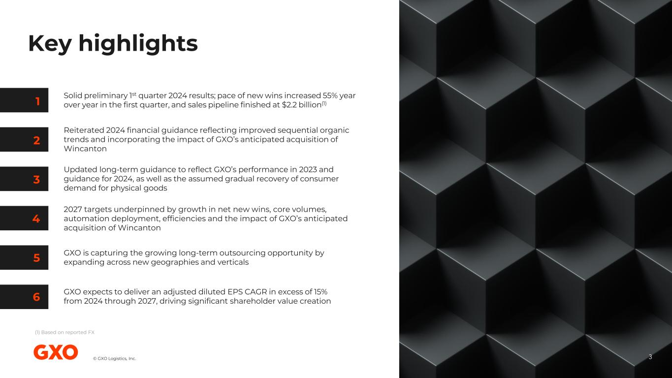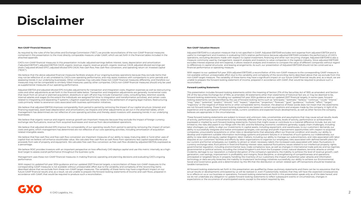 2© GXO Logistics, Inc. Disclaimer Non-GAAP Financial Measures As required by the rules of the Securities and Exchange Commission (“SEC”), we provide reconciliations of the non-GAAP financial measures contained in this presentation to the most directly comparable measure under GAAP, which are set forth in the financial tables included in the attached appendix. GXO’s non-GAAP financial measures in this presentation include: adjusted earnings before interest, taxes, depreciation and amortization (“adjusted EBITDA”), adjusted EBITDA CAGR, organic revenue, organic revenue growth, organic revenue CAGR, adjusted diluted earnings per share (“adjusted diluted EPS”), adjusted diluted EPS CAGR, free cash flow, free cash flow conversion, and operating return on invested capital (“ROIC”). We believe that the above adjusted financial measures facilitate analysis of our ongoing business operations because they exclude items that may not be reflective of, or are unrelated to, GXO’s core operating performance, and may assist investors with comparisons to prior periods and assessing trends in our underlying businesses. Other companies may calculate these non-GAAP financial measures differently, and therefore our measures may not be comparable to similarly titled measures used by other companies. GXO’s non-GAAP financial measures should only be used as supplemental measures of our operating performance. Adjusted EBITDA and adjusted diluted EPS includes adjustments for transaction and integration costs, litigation expenses as well as restructuring costs and other adjustments as set forth in the financial table below. Transaction and integration adjustments are generally incremental costs that result from an actual or planned acquisition, divestiture or spin-off and may include transaction costs, consulting fees, retention awards, internal salaries and wages (to the extent the individuals are assigned full-time to integration and transformation activities), and certain costs related to integrating and separating IT systems. Litigation expenses primarily relate to the settlement of ongoing legal matters. Restructuring costs primarily relate to severance costs associated with business optimization initiatives. We believe that adjusted EBITDA improves comparability from period to period by removing the impact of our capital structure (interest and financing expenses), asset base (depreciation and amortization), tax impacts and other adjustments as set out in the attached tables, which management has determined are not reflective of core operating activities and thereby assist investors with assessing trends in our underlying businesses. We believe that organic revenue and organic revenue growth are important measures because they exclude the impact of foreign currency exchange rate fluctuations, revenue from acquired businesses and revenue from deconsolidated operations. We believe that adjusted diluted EPS improve the comparability of our operating results from period to period by removing the impact of certain costs and gains, which management has determined are not reflective of our core operating activities, including amortization of acquisition- related intangible assets. We believe that free cash flow and free cash flow conversion are important measures of our ability to repay maturing debt or fund other uses of capital that we believe will enhance stockholder value. We calculate free cash flow as cash flows from operations less capital expenditures plus proceeds from sale of property and equipment. We calculate free cash flow conversion as free cash flow divided by adjusted EBITDA, expressed as a percentage. We believe ROIC provides investors with an important perspective on how effectively GXO deploys capital and use this metric internally as a high- level target to assess overall performance throughout the business cycle. Management uses these non-GAAP financial measures in making financial, operating and planning decisions and evaluating GXO’s ongoing performance. With respect to updated full-year 2024 guidance and our updated 2027 financial targets, a reconciliation of these non-GAAP measures to the corresponding GAAP measures is not available without unreasonable effort due to the variability and complexity of the reconciling items described above that we exclude from these non-GAAP target measures. The variability of these items may have a significant impact on our future GAAP financial results and, as a result, we are unable to prepare the forward-looking statements of income and cash flows, prepared in accordance with GAAP, that would be required to produce such a reconciliation. Non-GAAP Valuation Measure Adjusted EBITDAR is a valuation measure that is not specified in GAAP. Adjusted EBITDAR excludes rent expense from adjusted EBITDA and is useful to management and investors in evaluating GXO’s relative performance because adjusted EBITDAR considers the performance of GXO’s operations, excluding decisions made with respect to capital investment, financing and other non-recurring charges. Adjusted EBITDAR is also a measure commonly used by management, research analysts and investors to value companies in the logistics industry. Since adjusted EBITDAR excludes interest expense and rent expense, it allows research analysts and investors to compare the value of different companies without regard to differences in capital structures and leasing arrangements. As such, our presentation of Adjusted EBITDAR should not be construed as a financial performance or operating measure. With respect to our updated full-year 2024 adjusted EBITDAR, a reconciliation of this non-GAAP measure to the corresponding GAAP measure is not available without unreasonable effort due to the variability and complexity of the reconciling items described above that we exclude from this non-GAAP target measure. The variability of these items may have a significant impact on our future GAAP financial re