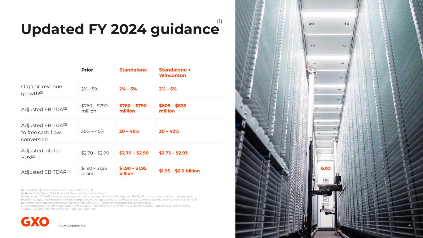 3© GXO Logistics, Inc. Key highlights Solid preliminary 1st quarter 2024 results; pace of new wins increased 55% year over year in the first quarter, and sales pipeline finished at $2.2 billion(1) Reiterated 2024 financial guidance reflecting improved sequential organic trends and incorporating the impact of GXO’s anticipated acquisition of Wincanton Updated long-term guidance to reflect GXO’s performance in 2023 and guidance for 2024, as well as the assumed gradual recovery of consumer demand for physical goods 2027 targets underpinned by growth in net new wins, core volumes, automation deployment, efficiencies and the impact of GXO’s anticipated acquisition of Wincanton GXO is capturing the growing long-term outsourcing opportunity by expanding across new geographies and verticals GXO expects to deliver an adjusted diluted EPS CAGR in excess of 15% from 2024 through 2027, driving significant shareholder value creation 1 2 3 4 5 6 (1) Based on reported FX