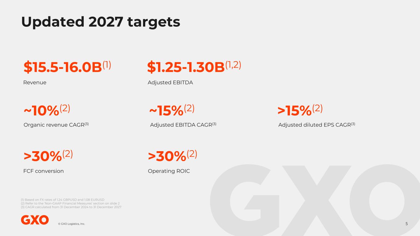 4© GXO Logistics, Inc. Updated FY 2024 guidance 4 Prior Standalone Standalone + Wincanton Organic revenue growth(2) 2% – 5% 2% – 5% 2% – 5% Adjusted EBITDA(2) $760 – $790 million $760 – $790 million $805 – $835 million Adjusted EBITDA(2) to free cash flow conversion 30% – 40% 30 – 40% 30 – 40% Adjusted diluted EPS(2) $2.70 – $2.90 $2.70 – $2.90 $2.73 – $2.93 Adjusted EBITDAR(3) $1.90 – $1.95 billion $1.90 – $1.95 billion $1.95 – $2.0 billion (1) Based on FX rates of 1.24 GBPUSD and 1.08 EURUSD (2) Refer to the ‘Non-GAAP Financial Measures’ section on slide 2. (3) Adjusted EBITDAR is a valuation measure that is not specified in GAAP. Adjusted EBITDAR is commonly used by management, research analysts and Investors to value companies in the logistics industry. Adjusted EBITDAR should not be construed as a financial performance or operating measure. Refer to the ‘Non-GAAP Valuation Measures’ section on slide 2. (4) We anticipate the following quarterly adjusted EBITDA phasing in 2024 for the guidance current + adjusting for Wincanton’s contribution: 1Q: c.19%; 2Q: c.22%; 3Q: c.28%; and 4Q: c.31%. (1)