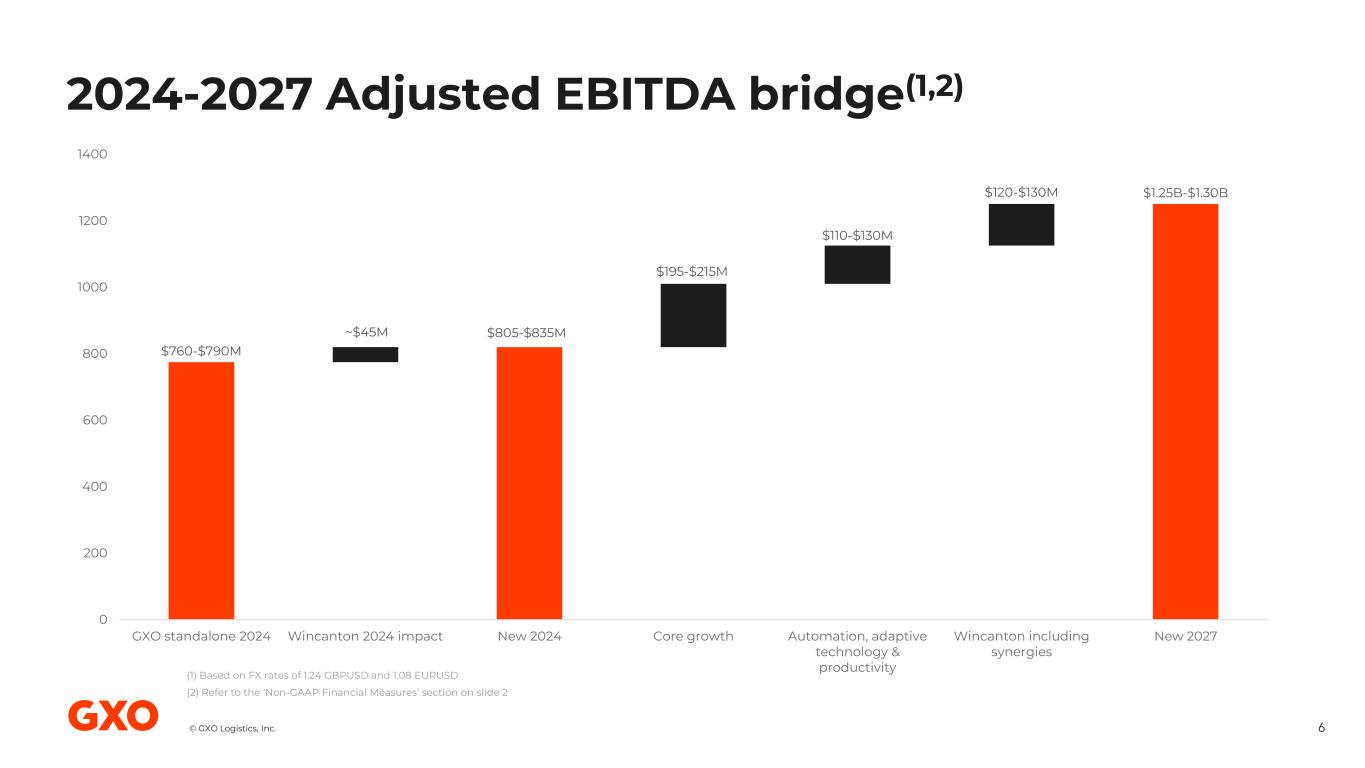 6© GXO Logistics, Inc. 2024-2027 Adjusted EBITDA bridge(1,2) $760-$790M ~$45M $805-$835M $195-$215M $110-$130M $120-$130M $1.25B-$1.30B 0 200 400 600 800 1000 1200 1400 GXO standalone 2024 Wincanton 2024 impact New 2024 Core growth Automation, adaptive technology & productivity Wincanton including synergies New 2027 (1) Based on FX rates of 1.24 GBPUSD and 1.08 EURUSD (2) Refer to the ‘Non-GAAP Financial Measures’ section on slide 2