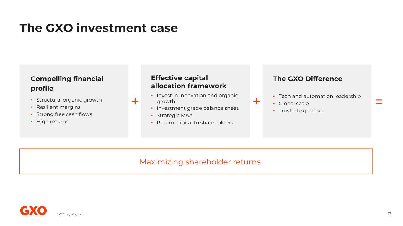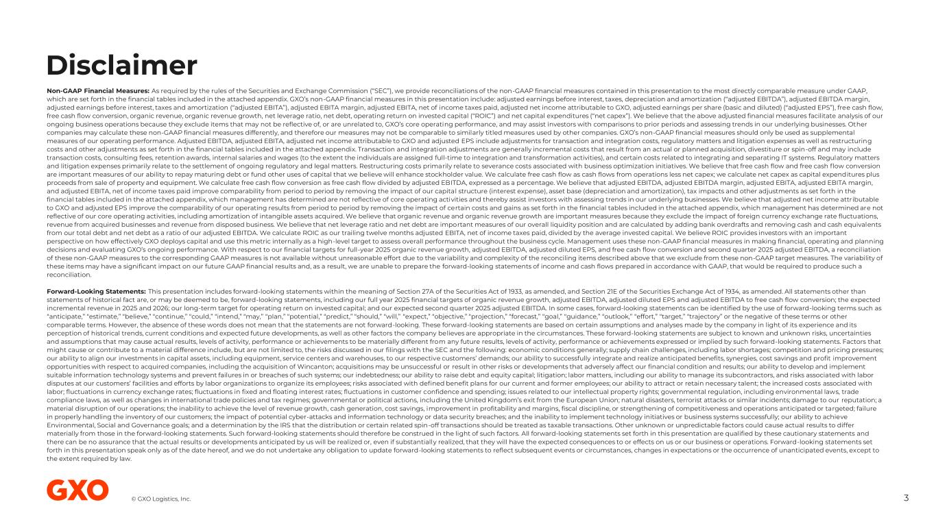 © GXO Logistics, Inc. Disclaimer 3 Non-GAAP Financial Measures: As required by the rules of the Securities and Exchange Commission (“SEC”), we provide reconciliations of the non-GAAP financial measures contained in this presentation to the most directly comparable measure under GAAP, which are set forth in the financial tables included in the attached appendix. GXO’s non-GAAP financial measures in this presentation include: adjusted earnings before interest, taxes, depreciation and amortization (“adjusted EBITDA”), adjusted EBITDA margin, adjusted earnings before interest, taxes and amortization (“adjusted EBITA”), adjusted EBITA margin, adjusted EBITA, net of income taxes paid, adjusted net income attributable to GXO, adjusted earnings per share (basic and diluted) (“adjusted EPS”), free cash flow, free cash flow conversion, organic revenue, organic revenue growth, net leverage ratio, net debt, operating return on invested capital (“ROIC”) and net capital expenditures (“net capex”). We believe that the above adjusted financial measures facilitate analysis of our ongoing business operations because they exclude items that may not be reflective of, or are unrelated to, GXO’s core operating performance, and may assist investors with comparisons to prior periods and assessing trends in our underlying businesses. Other companies may calculate these non-GAAP financial measures differently, and therefore our measures may not be comparable to similarly titled measures used by other companies. GXO’s non-GAAP financial measures should only be used as supplemental measures of our operating performance. Adjusted EBITDA, adjusted EBITA, adjusted net income attributable to GXO and adjusted EPS include adjustments for transaction and integration costs, regulatory matters and litigation expenses as well as restructuring costs and other adjustments as set forth in the financial tables included in the attached appendix. Transaction and integration adjustments are generally incremental costs that result from an actual or planned acquisition, divestiture or spin-off and may include transaction costs, consulting fees, retention awards, internal salaries and wages (to the extent the individuals are assigned full-time to integration and transformation activities), and certain costs related to integrating and separating IT systems. Regulatory matters and litigation expenses primarily relate to the settlement of ongoing regulatory and legal matters. Restructuring costs primarily relate to severance costs associated with business optimization initiatives. We believe that free cash flow and free cash flow conversion are important measures of our ability to repay maturing debt or fund other uses of capital that we believe will enhance stockholder value. We calculate free cash flow as cash flows from operations less net capex; we calculate net capex as capital expenditures plus proceeds from sale of property and equipment. We calculate free cash flow conversion as free cash flow divided by adjusted EBITDA, expressed as a percentage. We believe that adjusted EBITDA, adjusted EBITDA margin, adjusted EBITA, adjusted EBITA margin, and adjusted EBITA, net of income taxes paid improve comparability from period to period by removing the impact of our capital structure (interest expense), asset base (depreciation and amortization), tax impacts and other adjustments as set forth in the financial tables included in the attached appendix, which management has determined are not reflective of core operating activities and thereby assist investors with assessing trends in our underlying businesses. We believe that adjusted net income attributable to GXO and adjusted EPS improve the comparability of our operating results from period to period by removing the impact of certain costs and gains as set forth in the financial tables included in the attached appendix, which management has determined are not reflective of our core operating activities, including amortization of intangible assets acquired. We believe that organic revenue and organic revenue growth are important measures because they exclude the impact of foreign currency exchange rate fluctuations, revenue from acquired businesses and revenue from disposed business. We believe that net leverage ratio and net debt are important measures of our overall liquidity position and are calculated by adding bank overdrafts and removing cash and cash equivalents from our total debt and net debt as a ratio of our adjusted EBITDA. We calculate ROIC as our trailing twelve months adjusted EBITA, net of income taxes paid, divided by the average invested capital. We believe ROIC provides investors with an important perspective on how effectively GXO deploys capital and use this metric internally as a high-level target to assess overall performance throughout the business cycle. Management uses these non-GAAP financial measures in making financial, operating and planning decisions and evaluating GXO’s ongoing performance. With respect to our financial targets for full-year 2025 organic revenue growth, adjusted EBITDA, adjusted diluted EPS, and free cash flow conversion and second quarter 2025 adjusted EBITDA, a reconciliation of these non-GAAP measures to the corresponding GAAP measures is not available without unreasonable effort due to the variability and complexity of the reconciling items described above that we exclude from these non-GAAP target measures. The variability of these items may have a significant impact on our future GAAP financial results and, as a result, we are unable to prepare the forward-looking statements of income and cash flows prepared in accordance with GAAP, that would be required to produce such a reconciliation. Forward-Looking Statements: This presentation includes forward-looking statements within the meaning of Section 27A of the Securities Act of 1933, as amended, and Section 21E of the Securities Exchange Act of 1934, a