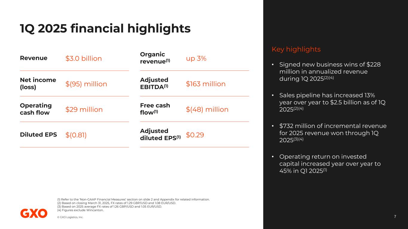 © GXO Logistics, Inc. 1Q 2025 executive summary Grew organically(1) across all regions, with fastest growth coming from Europe Increased pipeline to three-year high of $2.5 billion(2)(3) Reaffirmed full-year 2025 organic revenue growth and adjusted EBITDA guidance(1) Acted on share buyback authorization and repurchased 2.8 million shares in the quarter 6 (1) Refer to the ‘Non-GAAP Financial Measures’ section on slide 2. (2) Based on closing March 31, 2025, FX rates of 1.29 GBP/USD and 1.08 EUR/USD. (3) Figures exclude Wincanton.