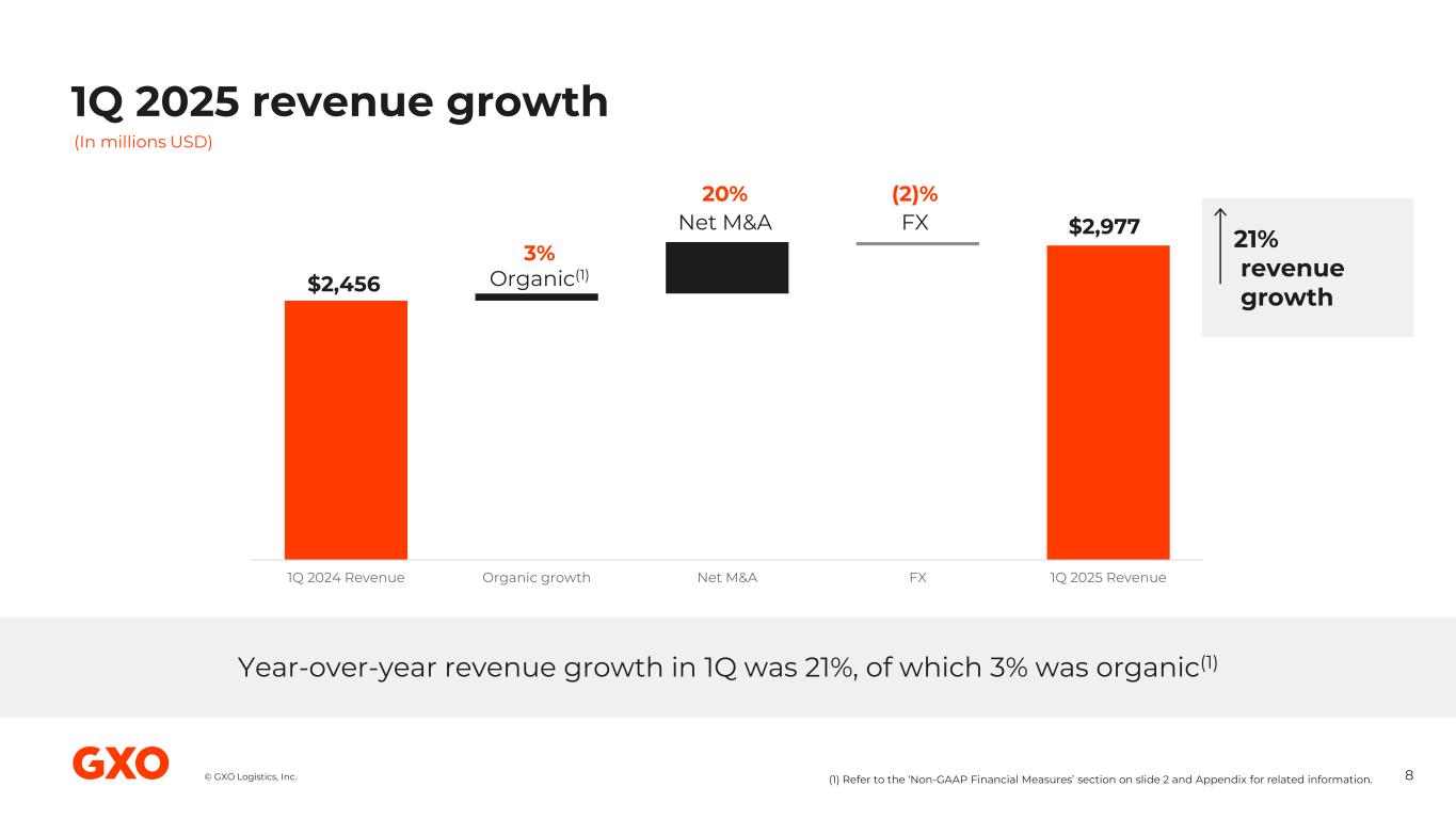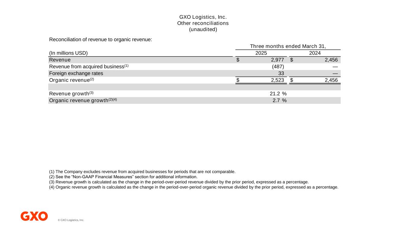© GXO Logistics, Inc. GXO Logistics, Inc. Other reconciliations (unaudited) Reconciliation of revenue to organic revenue: Three months ended March 31, (In millions USD) 2025 2024 Revenue $ 2,977 $ 2,456 Revenue from acquired business(1) (487) — Foreign exchange rates 33 — Organic revenue(2) $ 2,523 $ 2,456 Revenue growth(3) 21.2 % Organic revenue growth(2)(4) 2.7 % (1) The Company excludes revenue from acquired businesses for periods that are not comparable. (2) See the “Non-GAAP Financial Measures” section for additional information. (3) Revenue growth is calculated as the change in the period-over-period revenue divided by the prior period, expressed as a percentage. (4) Organic revenue growth is calculated as the change in the period-over-period organic revenue divided by the prior period, expressed as a percentage.