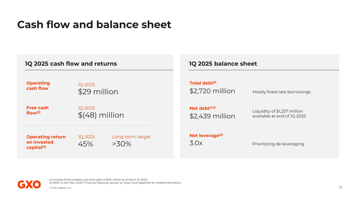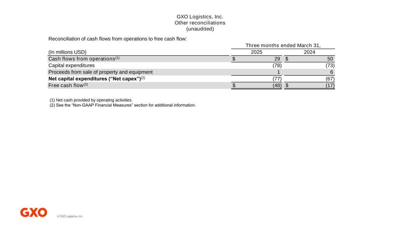 © GXO Logistics, Inc. GXO Logistics, Inc. Other reconciliations (unaudited) Reconciliation of cash flows from operations to free cash flow: Three months ended March 31, (In millions USD) 2025 2024 Cash flows from operations(1) $ 29 $ 50 Capital expenditures (78) (73) Proceeds from sale of property and equipment 1 6 Net capital expenditures (“Net capex”)(2) (77) (67) Free cash flow(2) $ (48) $ (17) (1) Net cash provided by operating activities. (2) See the “Non-GAAP Financial Measures” section for additional information.