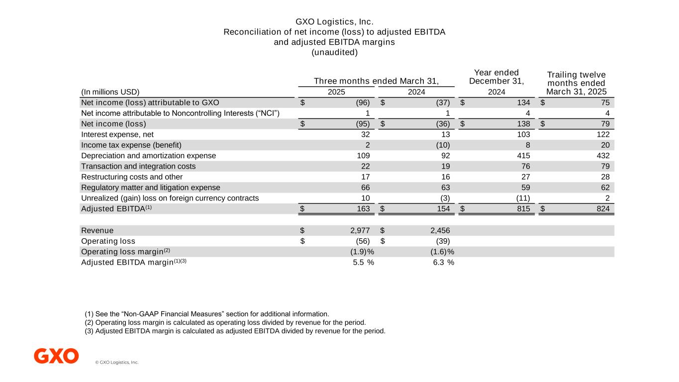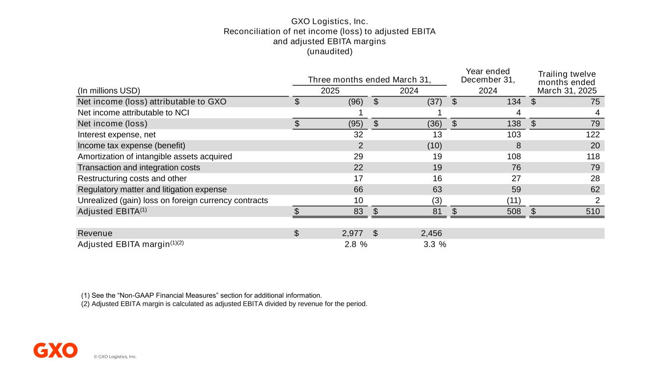 © GXO Logistics, Inc. GXO Logistics, Inc. Reconciliation of net income (loss) to adjusted EBITDA and adjusted EBITDA margins (unaudited) Three months ended March 31, Year ended December 31, Trailing twelve months ended March 31, 2025(In millions USD) 2025 2024 2024 Net income (loss) attributable to GXO $ (96) $ (37) $ 134 $ 75 Net income attributable to Noncontrolling Interests (“NCI”) 1 1 4 4 Net income (loss) $ (95) $ (36) $ 138 $ 79 Interest expense, net 32 13 103 122 Income tax expense (benefit) 2 (10) 8 20 Depreciation and amortization expense 109 92 415 432 Transaction and integration costs 22 19 76 79 Restructuring costs and other 17 16 27 28 Regulatory matter and litigation expense 66 63 59 62 Unrealized (gain) loss on foreign currency contracts 10 (3) (11) 2 Adjusted EBITDA(1) $ 163 $ 154 $ 815 $ 824 Revenue $ 2,977 $ 2,456 Operating loss $ (56) $ (39) Operating loss margin(2) (1.9) % (1.6) % Adjusted EBITDA margin(1)(3) 5.5 % 6.3 % (1) See the “Non-GAAP Financial Measures” section for additional information. (2) Operating loss margin is calculated as operating loss divided by revenue for the period. (3) Adjusted EBITDA margin is calculated as adjusted EBITDA divided by revenue for the period.