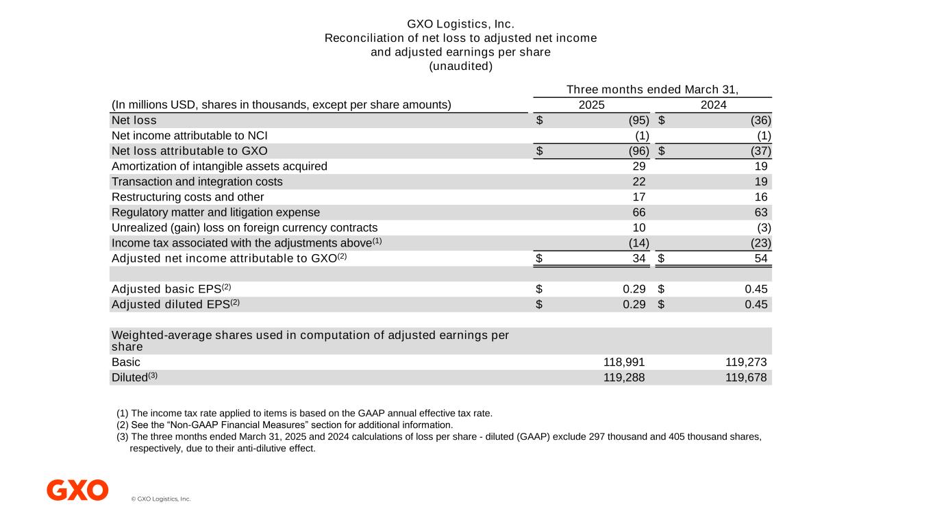 © GXO Logistics, Inc. GXO Logistics, Inc. Reconciliation of net loss to adjusted net income and adjusted earnings per share (unaudited) Three months ended March 31, (In millions USD, shares in thousands, except per share amounts) 2025 2024 Net loss $ (95) $ (36) Net income attributable to NCI (1) (1) Net loss attributable to GXO $ (96) $ (37) Amortization of intangible assets acquired 29 19 Transaction and integration costs 22 19 Restructuring costs and other 17 16 Regulatory matter and litigation expense 66 63 Unrealized (gain) loss on foreign currency contracts 10 (3) Income tax associated with the adjustments above(1) (14) (23) Adjusted net income attributable to GXO(2) $ 34 $ 54 Adjusted basic EPS(2) $ 0.29 $ 0.45 Adjusted diluted EPS(2) $ 0.29 $ 0.45 Weighted-average shares used in computation of adjusted earnings per share Basic 118,991 119,273 Diluted(3) 119,288 119,678 (1) The income tax rate applied to items is based on the GAAP annual effective tax rate. (2) See the “Non-GAAP Financial Measures” section for additional information. (3) The three months ended March 31, 2025 and 2024 calculations of loss per share - diluted (GAAP) exclude 297 thousand and 405 thousand shares, respectively, due to their anti-dilutive effect.