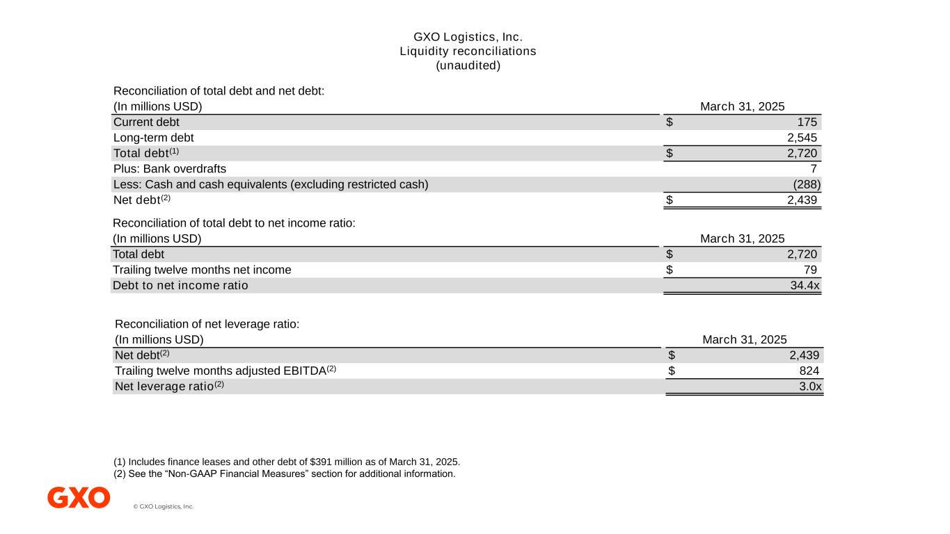 © GXO Logistics, Inc. GXO Logistics, Inc. Liquidity reconciliations (unaudited) Reconciliation of total debt and net debt: (In millions USD) March 31, 2025 Current debt $ 175 Long-term debt 2,545 Total debt(1) $ 2,720 Plus: Bank overdrafts 7 Less: Cash and cash equivalents (excluding restricted cash) (288) Net debt(2) $ 2,439 Reconciliation of total debt to net income ratio: (In millions USD) March 31, 2025 Total debt $ 2,720 Trailing twelve months net income $ 79 Debt to net income ratio 34.4x Reconciliation of net leverage ratio: (In millions USD) March 31, 2025 Net debt(2) $ 2,439 Trailing twelve months adjusted EBITDA(2) $ 824 Net leverage ratio(2) 3.0x (1) Includes finance leases and other debt of $391 million as of March 31, 2025. (2) See the “Non-GAAP Financial Measures” section for additional information.