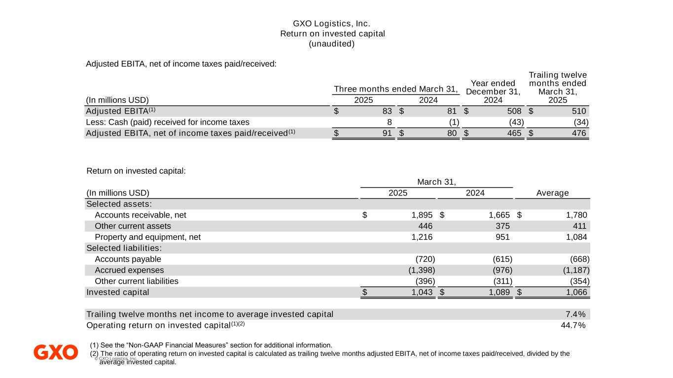 © GXO Logistics, Inc. Adjusted EBITA, net of income taxes paid/received: Three months ended March 31, Year ended December 31, 2024 Trailing twelve months ended March 31, 2025(In millions USD) 2025 2024 Adjusted EBITA(1) $ 83 $ 81 $ 508 $ 510 Less: Cash (paid) received for income taxes 8 (1) (43) (34) Adjusted EBITA, net of income taxes paid/received(1) $ 91 $ 80 $ 465 $ 476 Return on invested capital: March 31, (In millions USD) 2025 2024 Average Selected assets: Accounts receivable, net $ 1,895 $ 1,665 $ 1,780 Other current assets 446 375 411 Property and equipment, net 1,216 951 1,084 Selected liabilities: Accounts payable (720) (615) (668) Accrued expenses (1,398) (976) (1,187) Other current liabilities (396) (311) (354) Invested capital $ 1,043 $ 1,089 $ 1,066 Trailing twelve months net income to average invested capital 7.4 % Operating return on invested capital(1)(2) 44.7 % GXO Logistics, Inc. Return on invested capital (unaudited) (1) See the “Non-GAAP Financial Measures” section for additional information. (2) The ratio of operating return on invested capital is calculated as trailing twelve months adjusted EBITA, net of income taxes paid/received, divided by the average invested capital.
