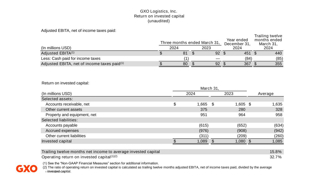 © GXO Logistics, Inc. Adjusted EBITA, net of income taxes paid: Three months ended March 31, Year ended December 31, 2024 Trailing twelve months ended March 31, 2024(In millions USD) 2024 2023 Adjusted EBITA(1) $ 81 $ 92 $ 451 $ 440 Less: Cash paid for income taxes (1) — (84) (85) Adjusted EBITA, net of income taxes paid(1) $ 80 $ 92 $ 367 $ 355 Return on invested capital: March 31, (In millions USD) 2024 2023 Average Selected assets: Accounts receivable, net $ 1,665 $ 1,605 $ 1,635 Other current assets 375 280 328 Property and equipment, net 951 964 958 Selected liabilities: Accounts payable (615) (652) (634) Accrued expenses (976) (908) (942) Other current liabilities (311) (209) (260) Invested capital $ 1,089 $ 1,080 $ 1,085 Trailing twelve months net income to average invested capital 15.8 % Operating return on invested capital(1)(2) 32.7 % GXO Logistics, Inc. Return on invested capital (unaudited) (1) See the “Non-GAAP Financial Measures” section for additional information. (2) The ratio of operating return on invested capital is calculated as trailing twelve months adjusted EBITA, net of income taxes paid, divided by the average invested capital.