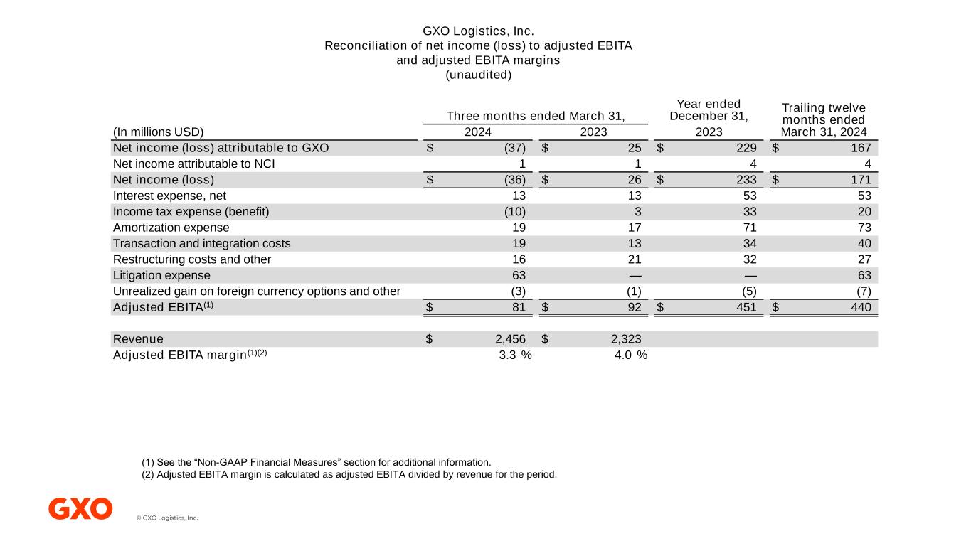 © GXO Logistics, Inc. GXO Logistics, Inc. Reconciliation of net income (loss) to adjusted EBITA and adjusted EBITA margins (unaudited) Three months ended March 31, Year ended December 31, Trailing twelve months ended March 31, 2024(In millions USD) 2024 2023 2023 Net income (loss) attributable to GXO $ (37) $ 25 $ 229 $ 167 Net income attributable to NCI 1 1 4 4 Net income (loss) $ (36) $ 26 $ 233 $ 171 Interest expense, net 13 13 53 53 Income tax expense (benefit) (10) 3 33 20 Amortization expense 19 17 71 73 Transaction and integration costs 19 13 34 40 Restructuring costs and other 16 21 32 27 Litigation expense 63 — — 63 Unrealized gain on foreign currency options and other (3) (1) (5) (7) Adjusted EBITA(1) $ 81 $ 92 $ 451 $ 440 Revenue $ 2,456 $ 2,323 Adjusted EBITA margin(1)(2) 3.3 % 4.0 % (1) See the “Non-GAAP Financial Measures” section for additional information. (2) Adjusted EBITA margin is calculated as adjusted EBITA divided by revenue for the period.