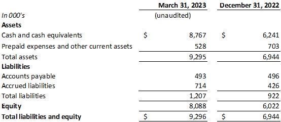 As of March 31, 2023, Dermata had $8.8 million in cash and cash equivalents, compared to $6.2 million as of December 31, 2022. The increase in cash and cash equivalents resulted from $4.2 million net proceeds from the March 2023 public offering, offset by $1.6 million in cash used in operations for the first quarter of 2023. Dermata expects its current cash resources are sufficient to fund operations into the first quarter of 2024.